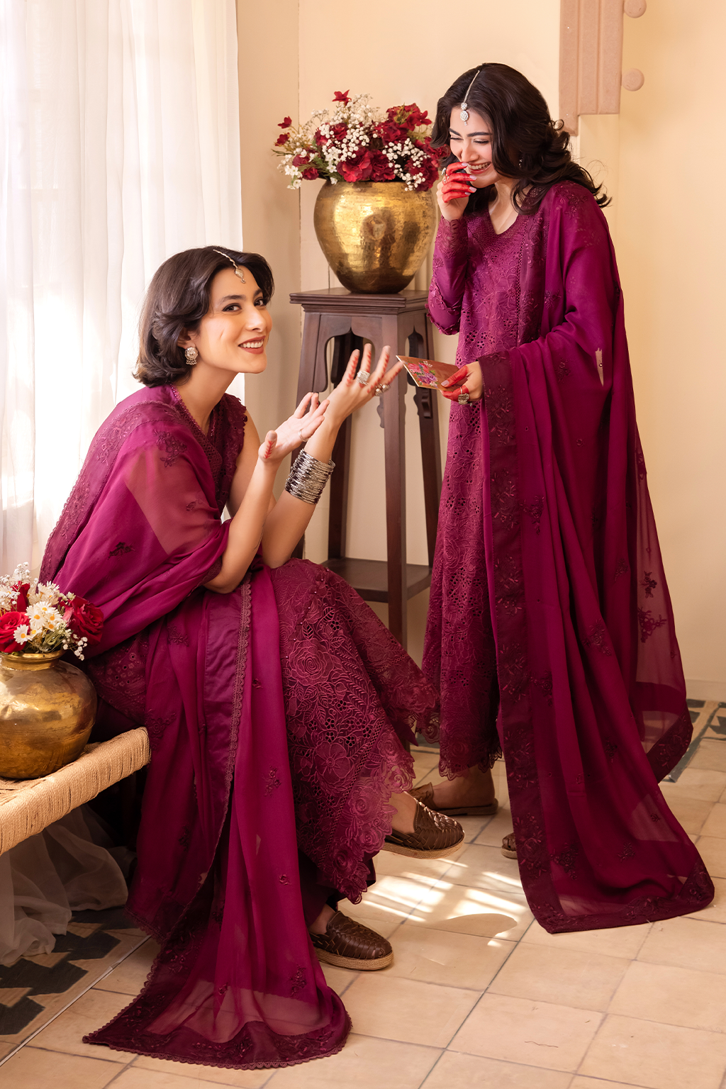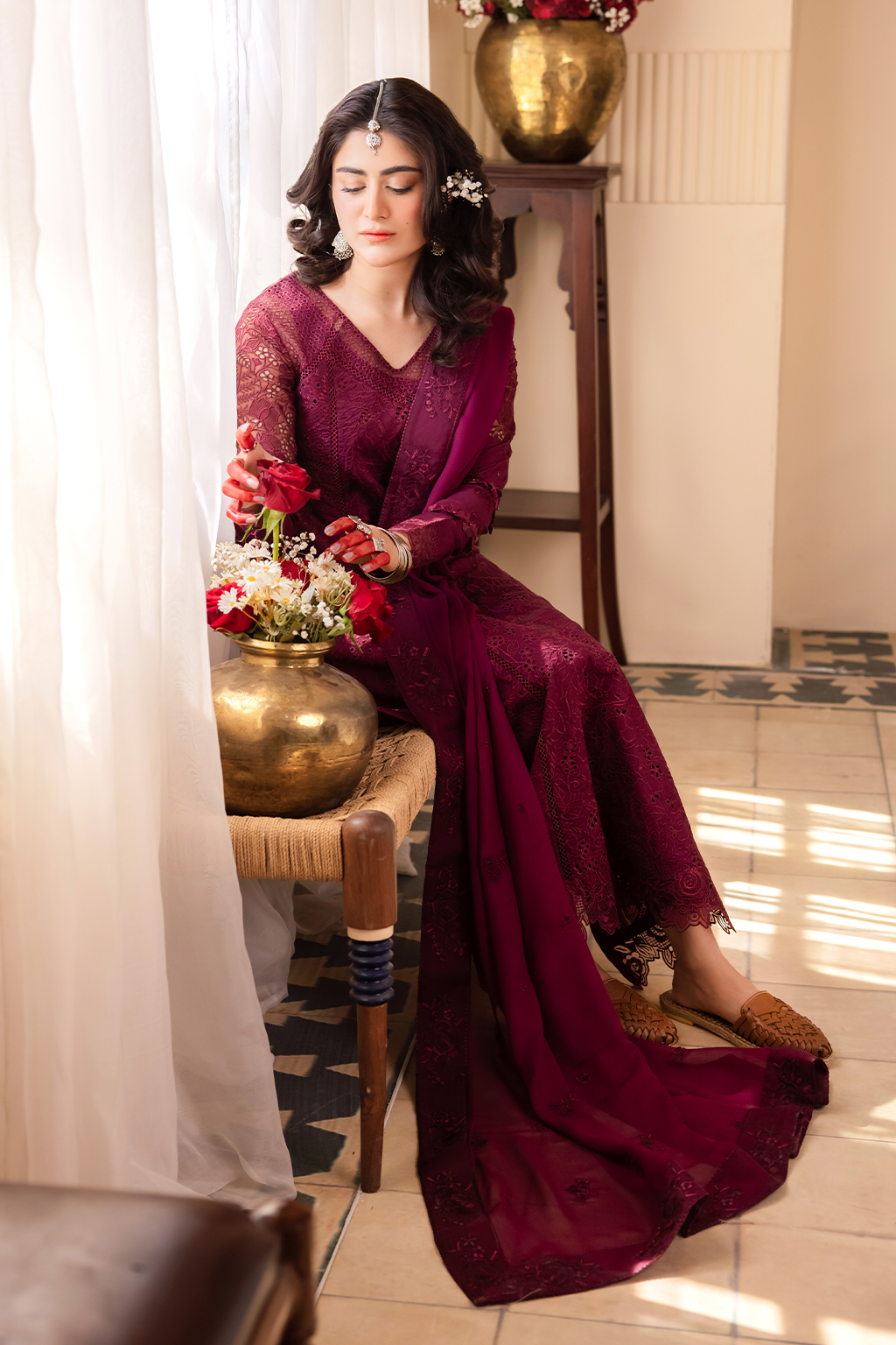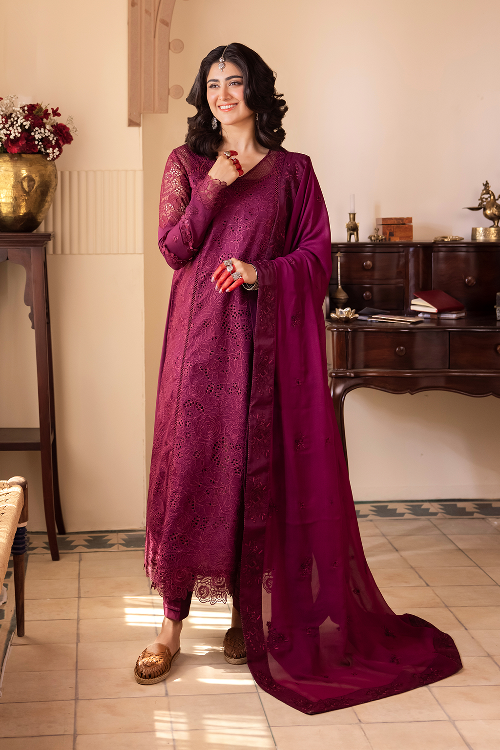 Fabric: Shirt Center Panel: Borer Embroidered Lawn (1.10 m) Shirt Side Panel: Borer Embroidered Lawn (1.10 m) Shirt Back: Borer Embroidered Lawn (1.25 m) Neck Lace: Embroidered Organza (0.65 m) Front & Back Lace: Borer Embroidered Organza (1.90 m) Sleeves: Embroidered Lawn (0.65 m) Sleeves Lace 01: Borer Embroidered Organza(1.15 m) Sleeves Lace 02: Embroidered Organza(0.85 m) Dupatta: Embroidered Chiffon(2.5 m) Dupatta Lace: Embroidered Organza(7.5 m) Trouser: Dyed Cambric (2.5 m) |
