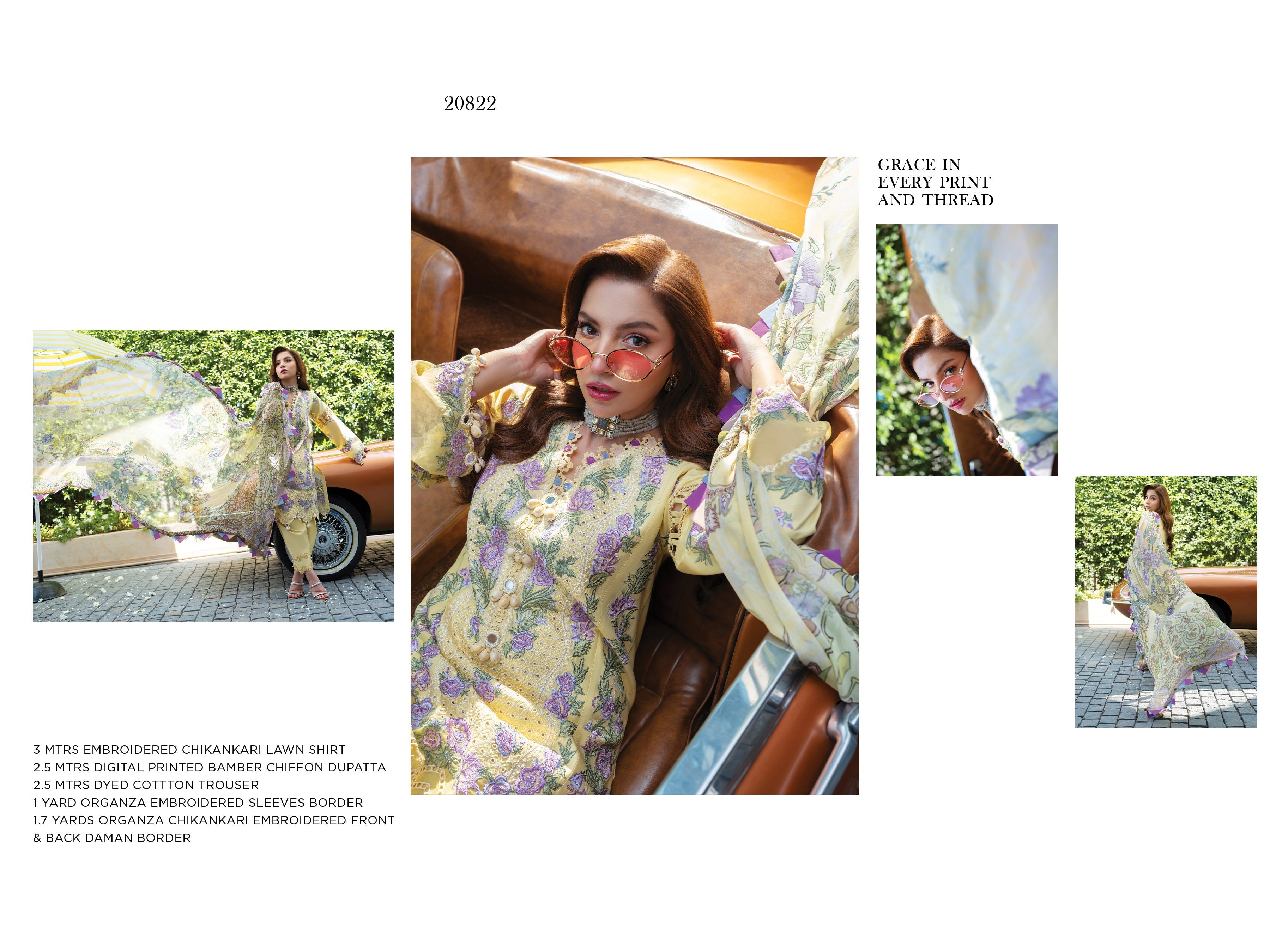 Fabric: 3 MTRS EMBROIDERED CHIKANKARI LAWN SHIRT 2.5 MTRS DIGITAL PRINTED BAMBER CHIFFON DUPATTA 2.5 MTRS DYED COTTTON TROUSER 1 YARD ORGANZA EMBROIDERED SLEEVES BORDER 1.7 YARDS ORGANZA CHIKANKARI EMBROIDERED FRONT & BACK DAMAN BORDER |