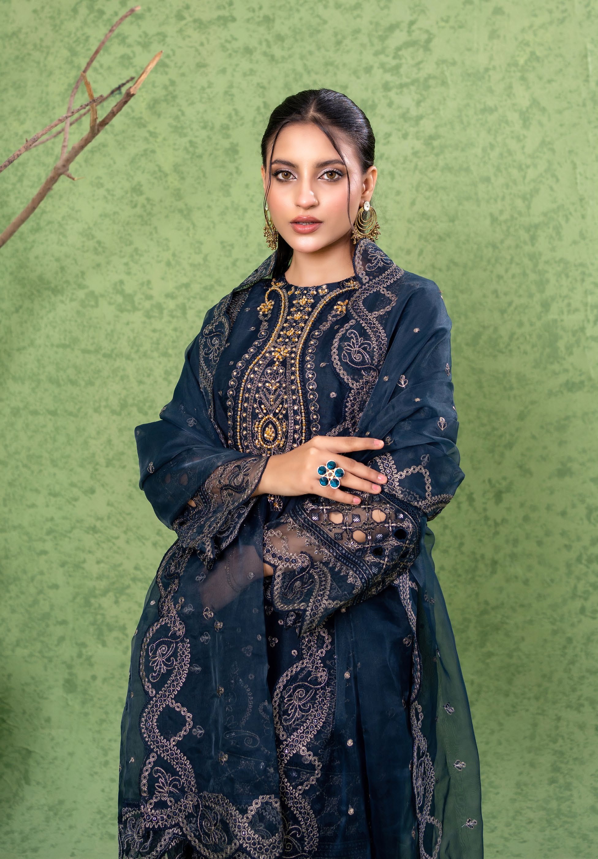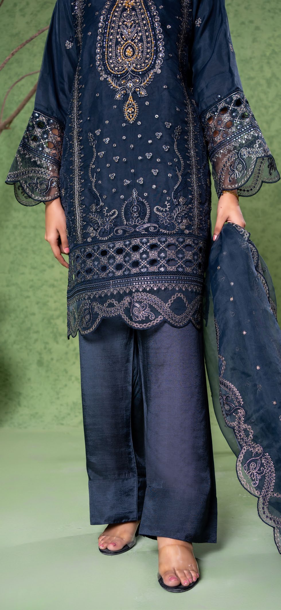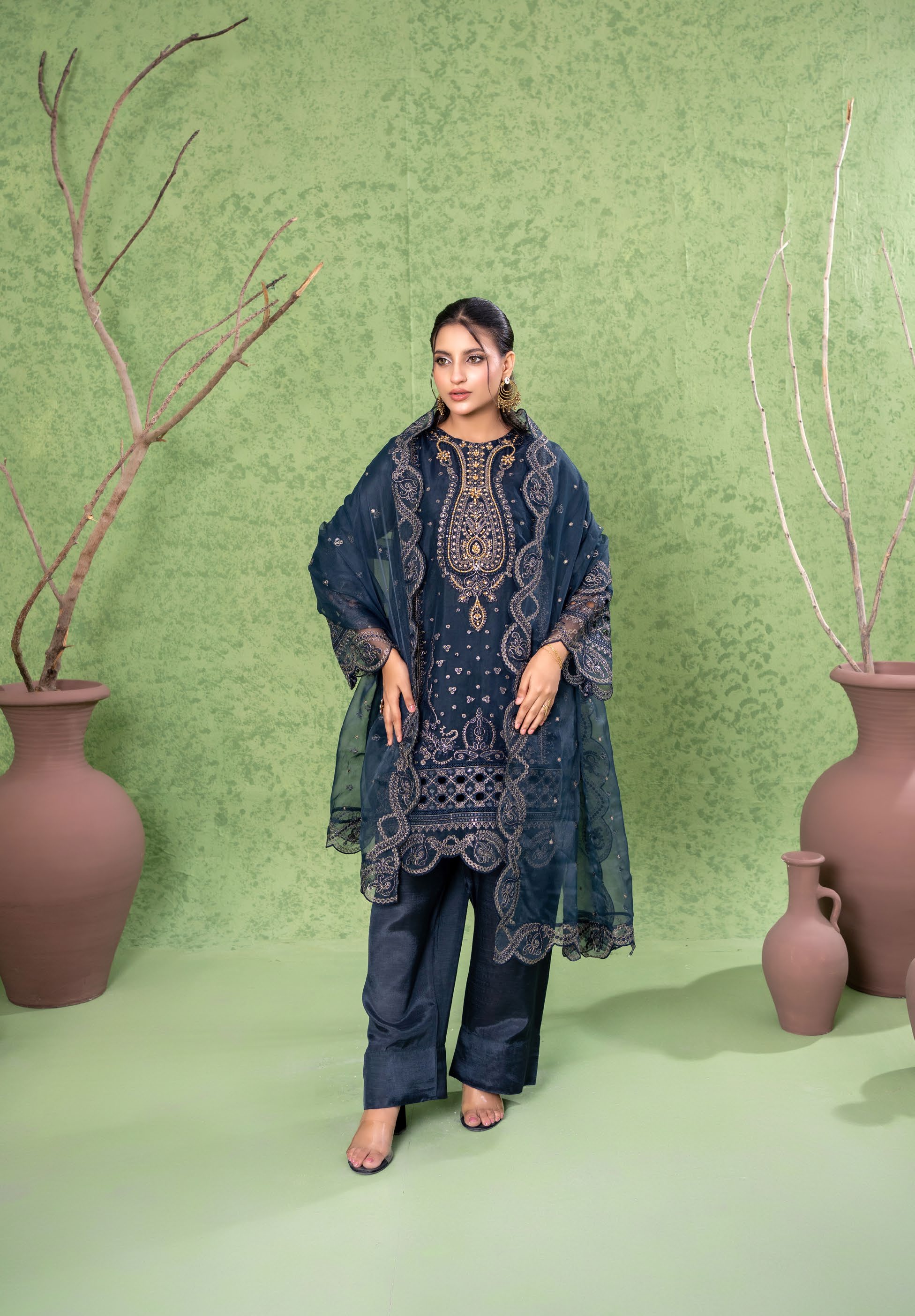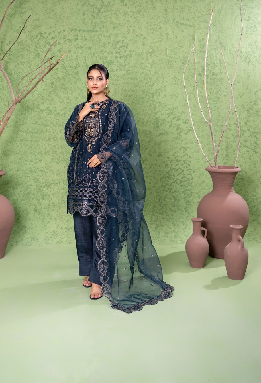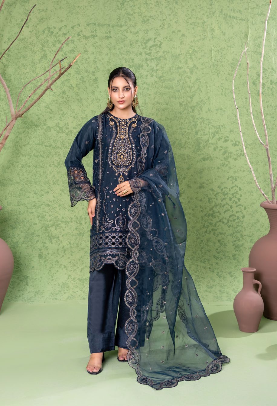 Summary: Step into elegance with this stunning Navy Blue Pakistani suit, beautifully crafted from lightweight organza, perfect for your spring and summer festive wear collection. This 3-piece stitched formal dress features a meticulously embroidered short-length shirt paired with a classic farshi shalwar, exuding traditional charm. The sheer organza fabric provides a graceful drape, ideal for evening events and party wear. Detailed with intricate patterns, this ethnic wear ensemble offers a sophisticated look. Elevate your wardrobe with this exquisite Pakistani dress, ideal for Eid celebrations, wedding festivities, or formal gatherings. Shop online to upgrade your closet!