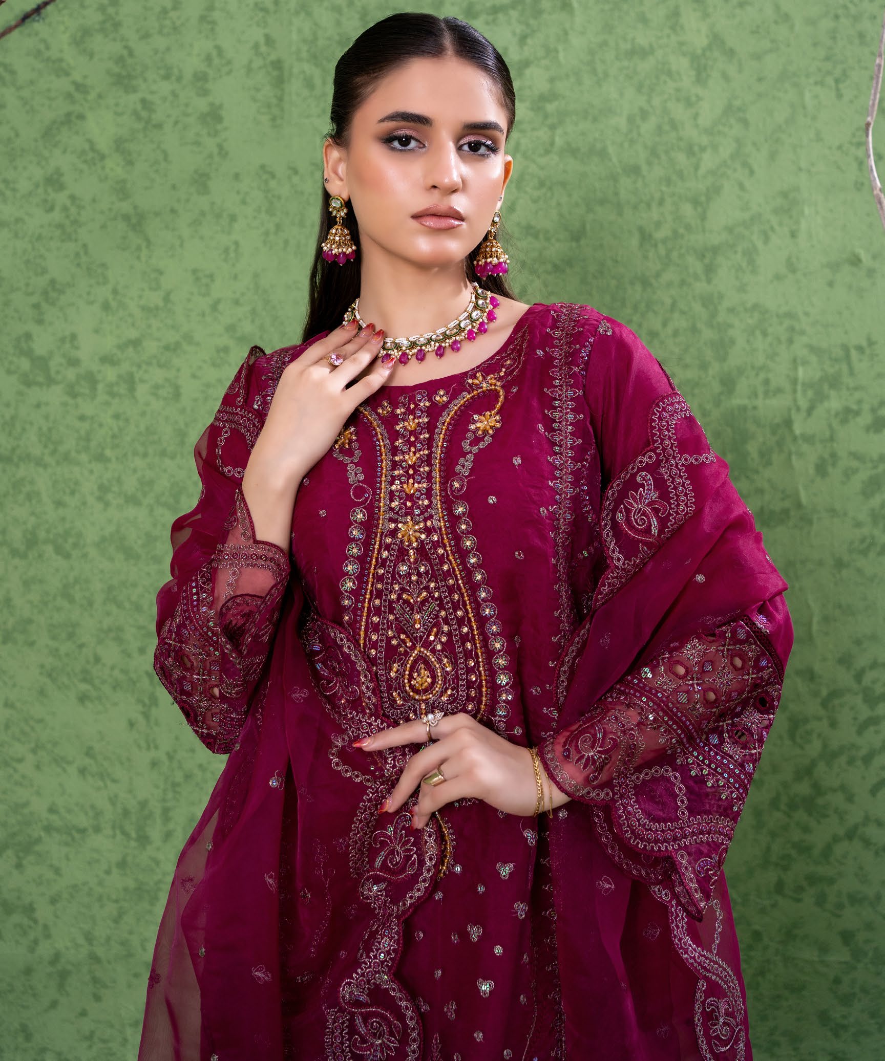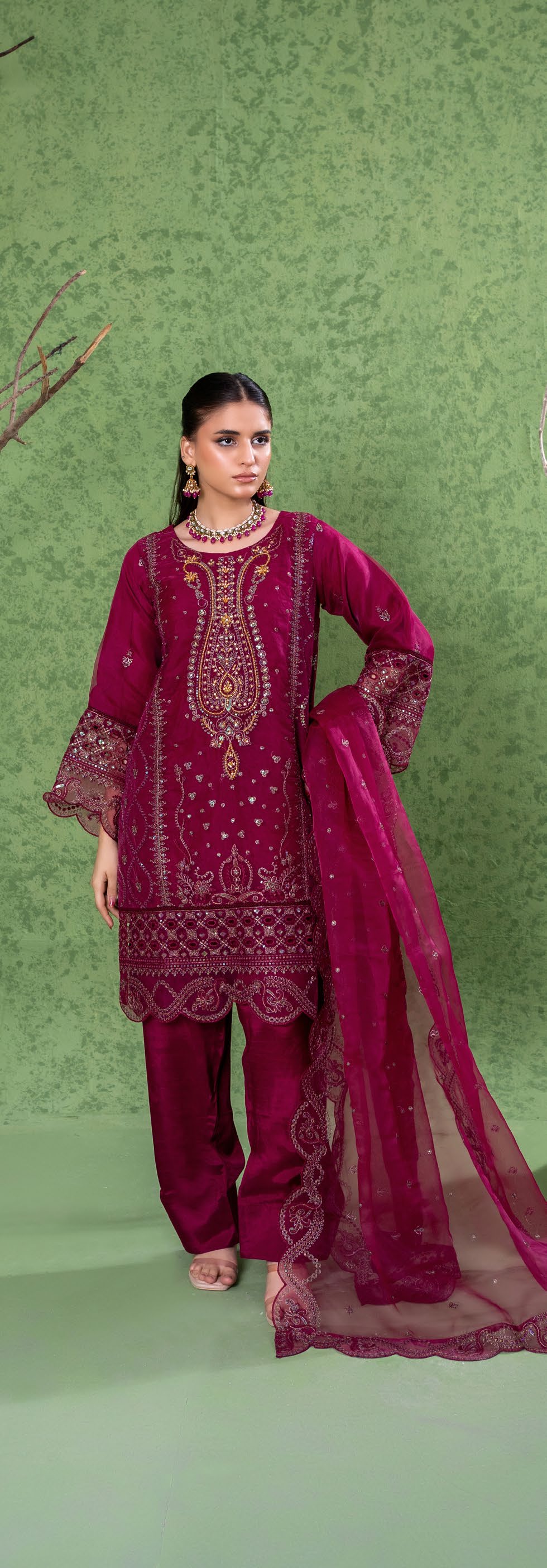 Summary: Elevate your festive wardrobe with this stunning Magenta Organza Pakistani Suit. This 3-piece stitched ethnic wear features an intricately embroidered short-length kameez paired with a classic farshi shalwar, offering a truly traditional silhouette. Woven from breathable, lightweight organza, this Pakistani dress is an impeccable choice for spring and summer celebrations. The vibrant magenta tones make it an exceptional outfit for formal evening events, wedding wear, and cultural festivities. Embrace the charm of authentic Pakistani summer dresses. Shop online today to secure this exquisite formal attire, perfect for your next big festive occasion!