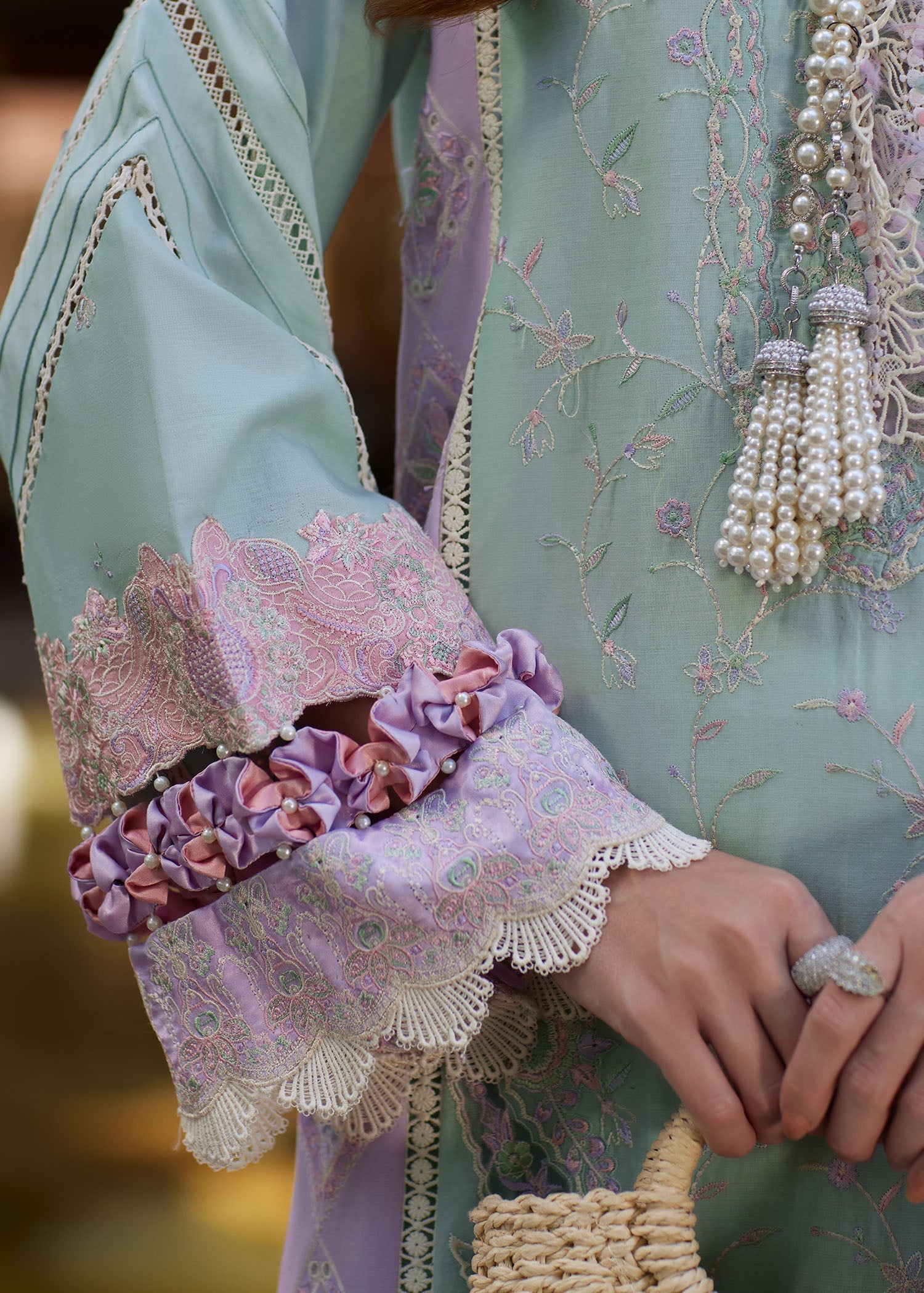 Summary: Embrace ethereal elegance with this stunning Kanwal Malik Pakistani suit. The kameez, in a serene sea green hue, is crafted from premium lawn, making it a breathable choice for summer festivities. It features a masterclass of design with intricate floral embroidery and delicate laser-cut panels in complementary lilac and pink tones. The romantic, lace-trimmed sleeves add a touch of modern grace. As a quintessential piece of Pakistani ethnic wear, this formal outfit is the perfect choice for Eid celebrations, daytime weddings, or any elegant soiree, offering a regal and sophisticated look.