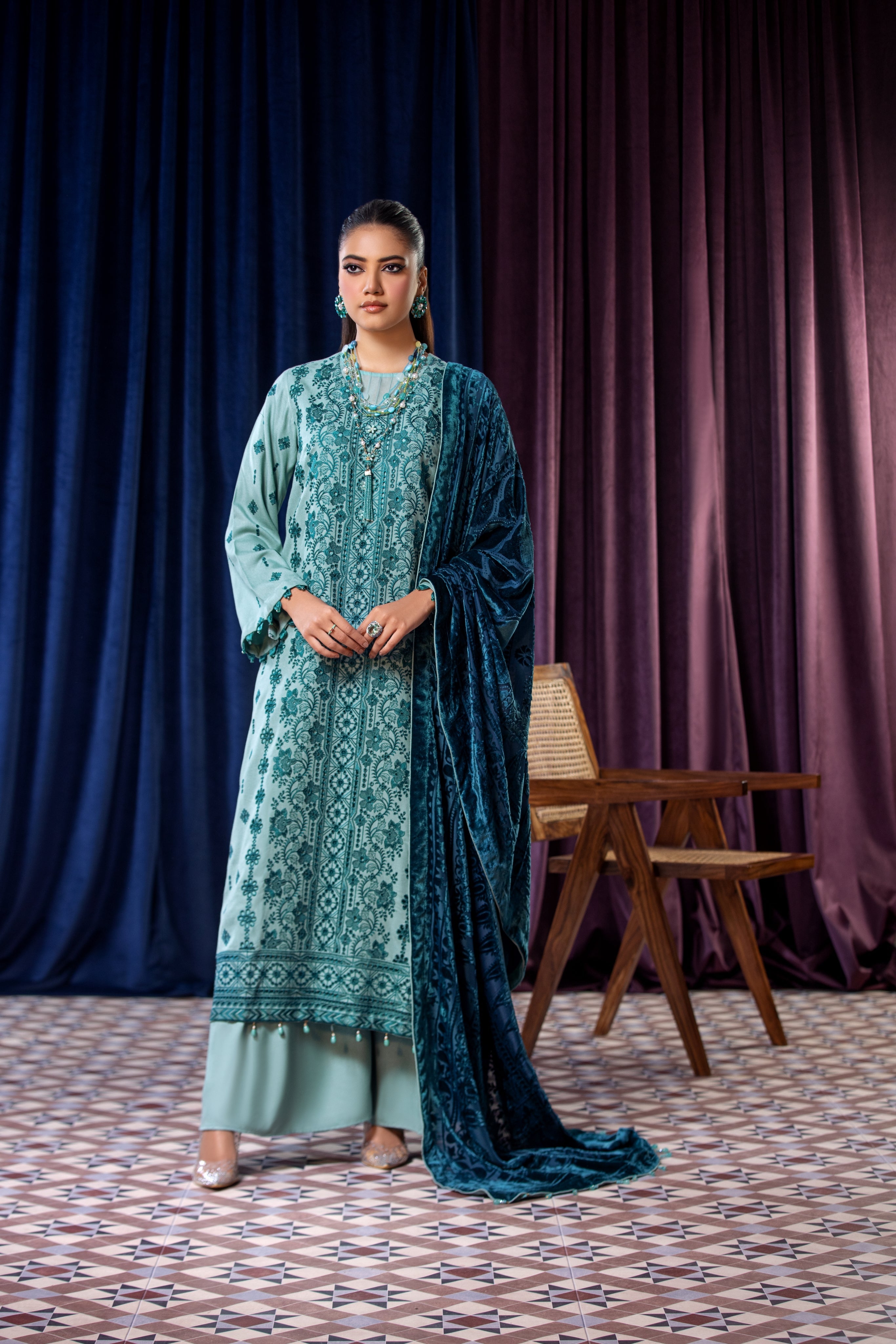 Summary: Step into sophistication with this beautiful Sea Green Pakistani suit from Lala's winter collection. Crafted from premium dyed wool, the kameez offers warmth and a graceful drape, making it ideal for the Fall/Winter season. It features intricate, tone-on-tone embroidery, creating a look of understated luxury. This unstitched ethnic wear allows for custom tailoring to achieve the perfect fit. As a quintessential piece of formal clothing, this Pakistani dress is an excellent choice for winter weddings, festive gatherings, or any elegant evening event.