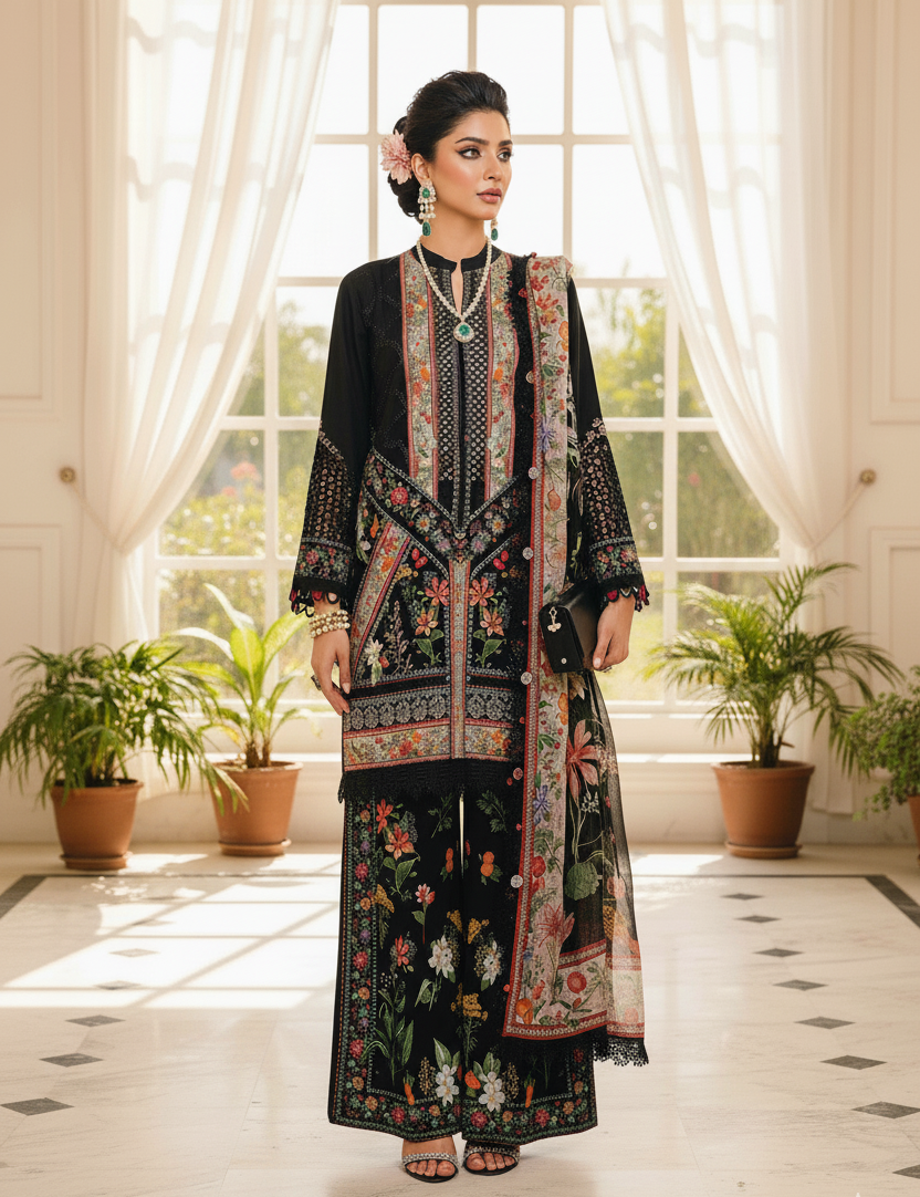 Summary: Make a statement this Eid with the exquisite MARIA.B MPrints Lawn suit in classic black (MPT-2610-B). This unstitched three-piece ensemble is crafted from high-quality lawn fabric, ensuring breathability and comfort for those warm summer celebrations. The shirt features a striking black base adorned with delicate floral embroidery, adding a touch of elegance to the overall look. The neckline and sleeves are embellished with embroidered organza patti and intricate lace detailing, creating a captivating visual appeal. Paired with printed cambric trousers and a flowing printed chiffon dupatta, this ensemble offers a complete and stylish look. Perfect for Eid festivities, evening parties, or any special occasion, this MARIA.B creation is a must-have for your wardrobe. This suit is unstitched, allowing you to tailor it to your exact measurements and preferences. Embrace the festive spirit and exude grace with this beautiful Pakistani suit.