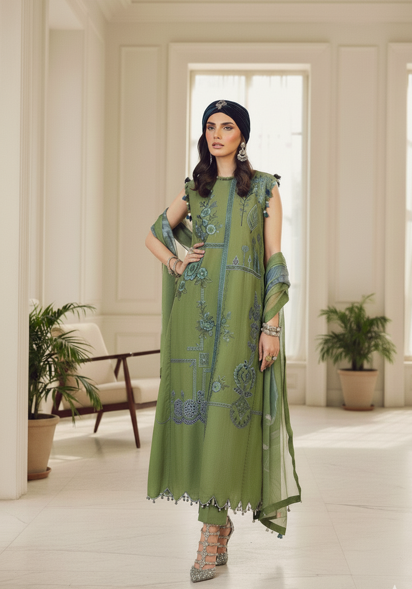 Summary: Embrace sophistication with this stunning green Pakistani suit from the MARIA.B MPrints Fall Edition. The kameez is crafted from high-quality Cambric, a fabric renowned for its comfort and warmth, making it an ideal choice for the Fall/Winter season. It features an exquisitely embroidered front panel, lending an air of formal elegance to the design. This rich green ethnic wear is a perfect outfit for festive occasions like Mehndi celebrations or formal evening gatherings. This unstitched Pakistani dress allows for custom tailoring, ensuring a perfect fit for any elegant event.