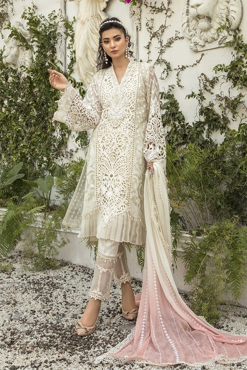 Fabric: Hand-woven organza jacquard front Hand-woven organza jacquard back Hand-woven organza jacquard sleeves Organza embroidered center panel front Organza embroidered cutwork sleeve patti 1 Organza embroidered sleeve patti 2 Organza embroidered ghera lace (front & back) Hand-woven jacquard trouser Organza embroidered trouser lace Embellished neck patti Embellished neck patch Chiffon embroidered dupatta Schiffli embroidered dupatta lace Cotton satin undershirt |