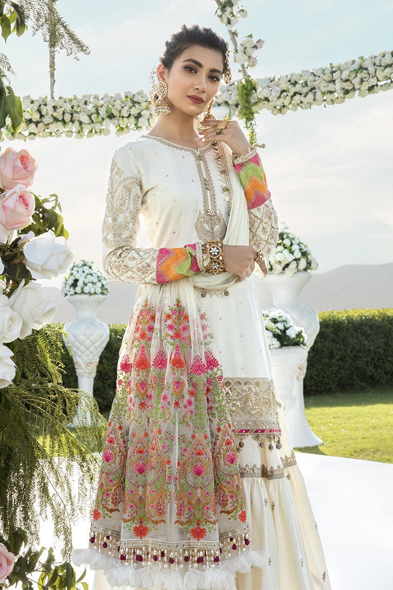 Fabric: Embroidered Cotton Satin Front Embroidered Cotton Satin Back Embroidered Cotton Satin Sleeves' Embroidered Net Dupatta Embroidered Cotton Satin Gharara Embroidered Cotton Satin Dupatta Patti Embnroidered Organza Neck Patti Embroidered Organza Neck Motif Embroidered Organza Gharara Patti Embroidered Organza Ghera Lace |