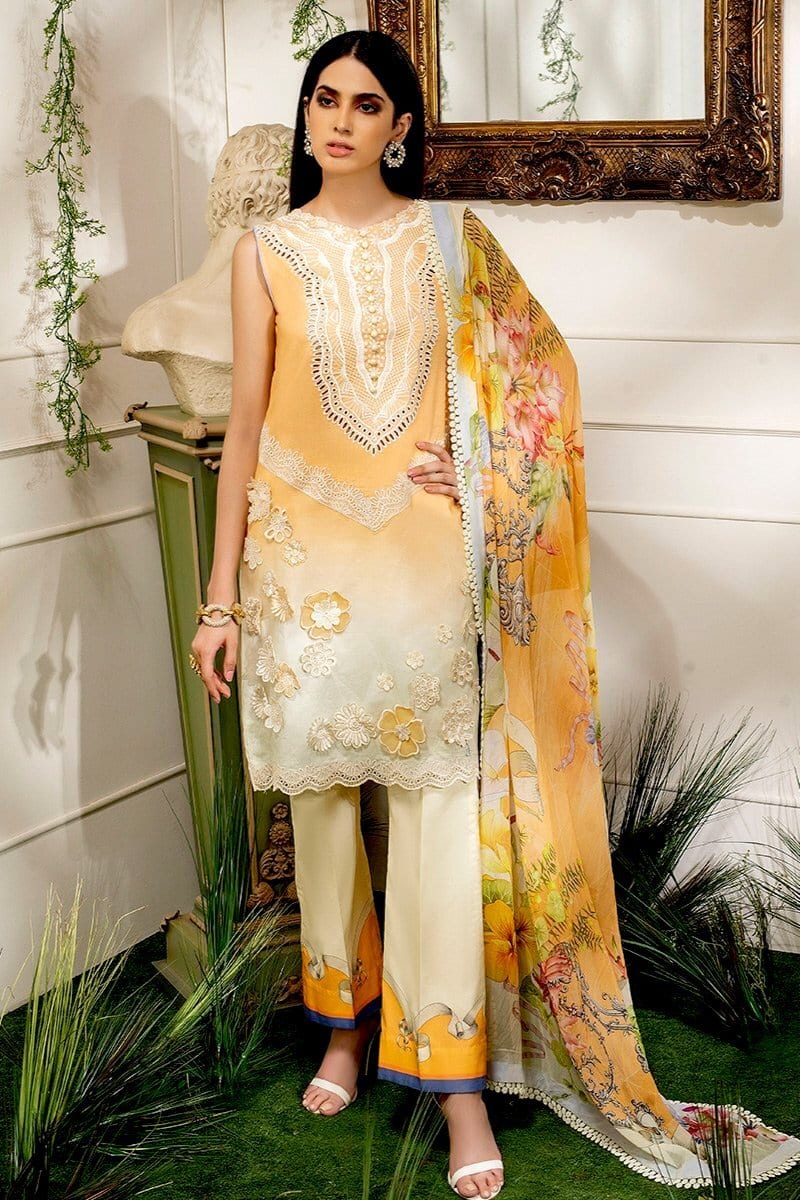 Fabric: -Gradient dyed embroidered front -Digital print back and sleeves -Digital print chiffon dupatta -Dyed trousers -Printed border for trouser -Embroidered 3D assorted flowers (28) -Embroidered lace for hem and styling -Buttons (10) -Pearls for finishing (40) *Dupatta finishing was used for styling only, it is not included in the package. |