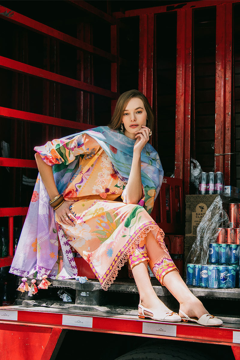 Fabric: Shirt: • Printed lawn front • Printed lawn back & sleeves • Embroidered neckline (organza) • Crochet lace for front & back daman Dupatta: • Printed Silk dupatta Trouser: • Printed trousers |