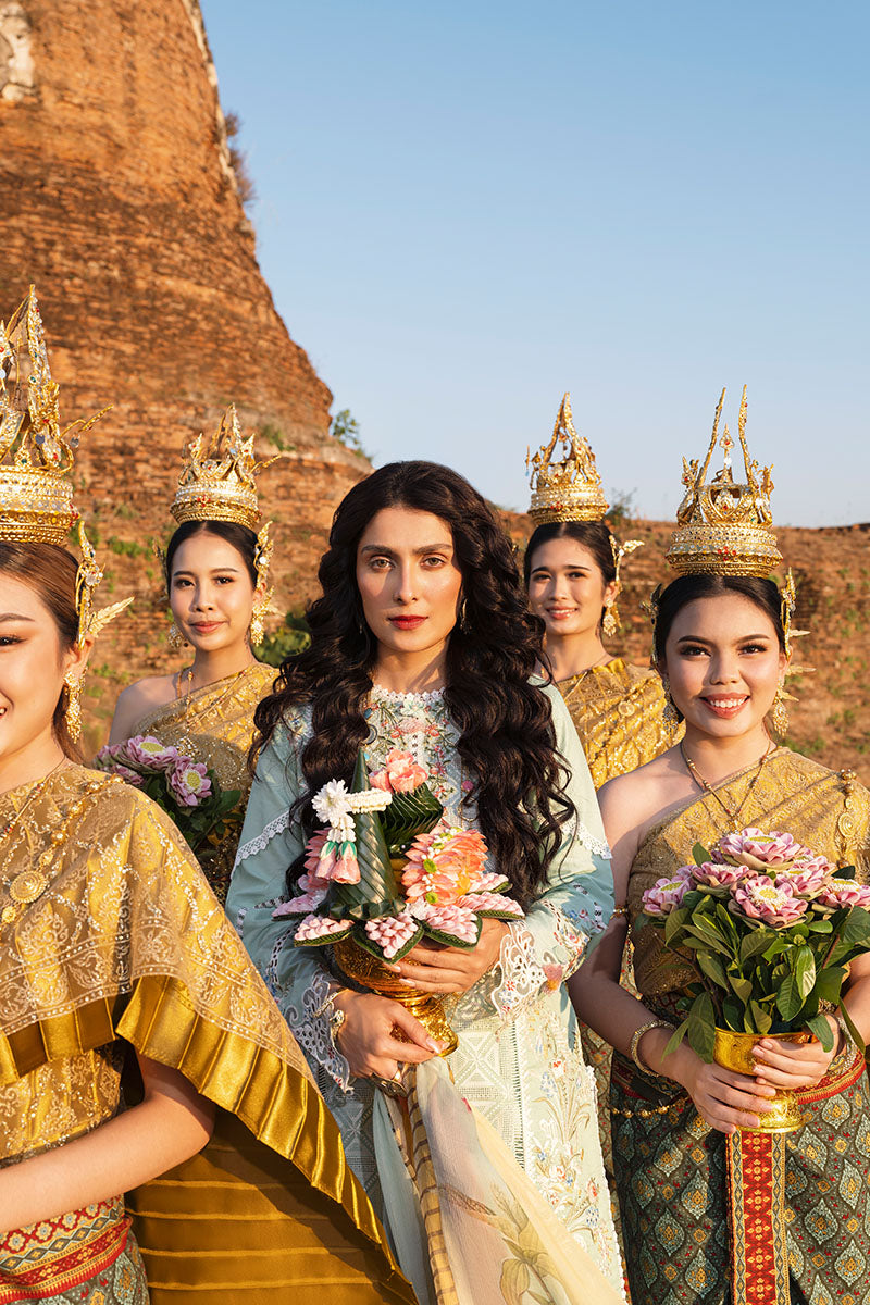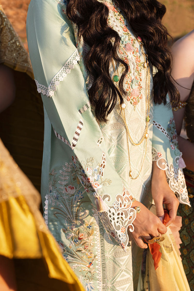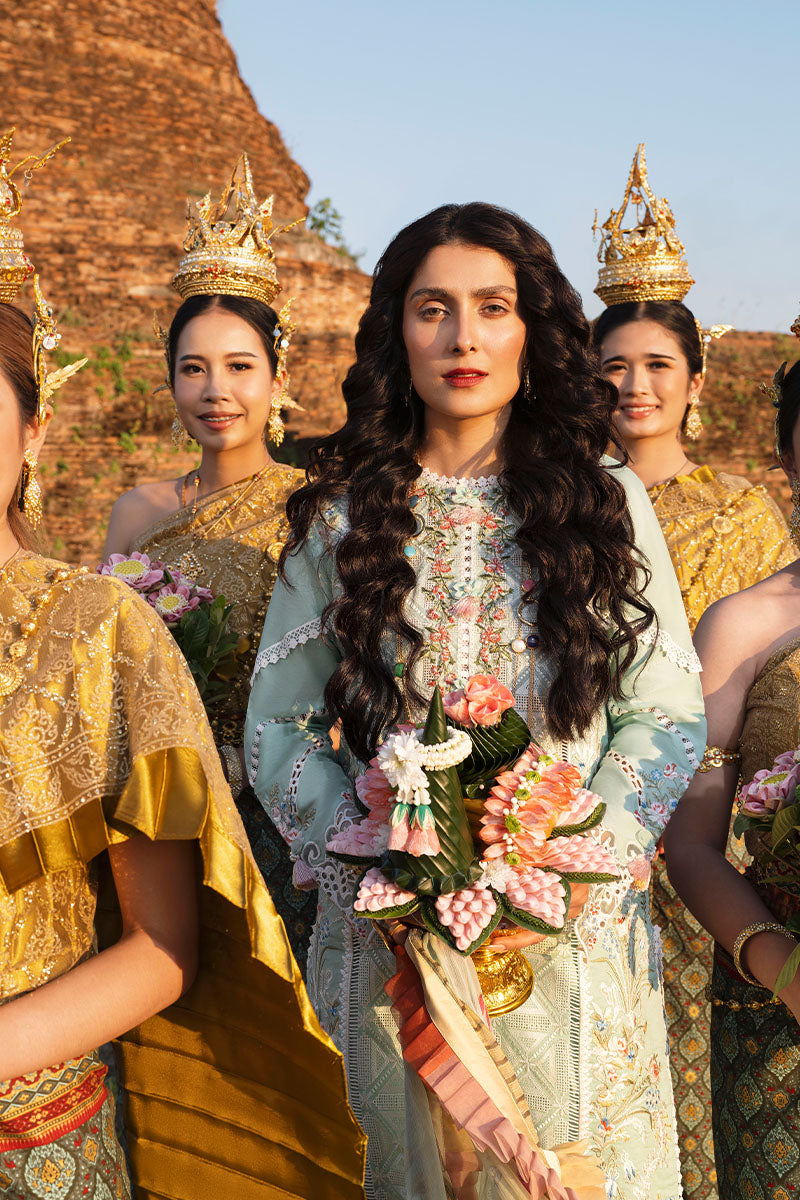 Parinya is crafted from a surreal sea green canvas with Tarkashi embroidered front panel and and array of embroidered florals on the sides. This stunning design is enhanced with a bunch of crochet and seedhri laces that ooze ethereal feminism. The highlight of this design are the embellished organza and thread buttons placed on the neckline, sleeves and back along with a floral chiffon dupata in soothing shades of sea green and lemon that further elevate the beauty of this ensemble.