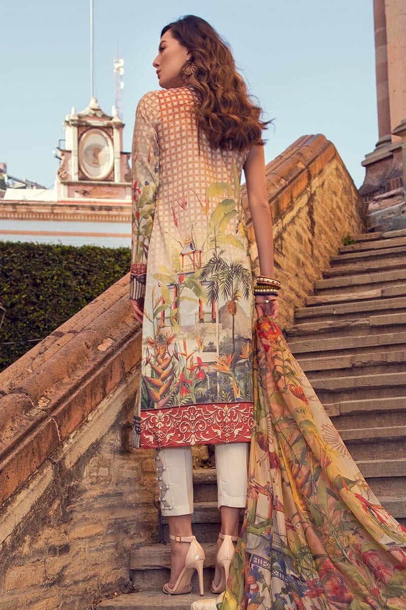 Fabric: Digital print embroidered front Digital print back and sleeves Digital print pure silk dupatta Dyed trouser Zig-zag embroidered finishing patti for shirt Embroidered hem border |