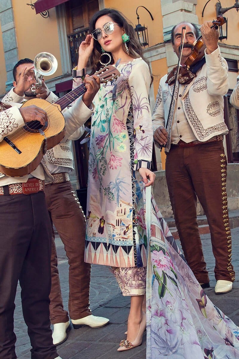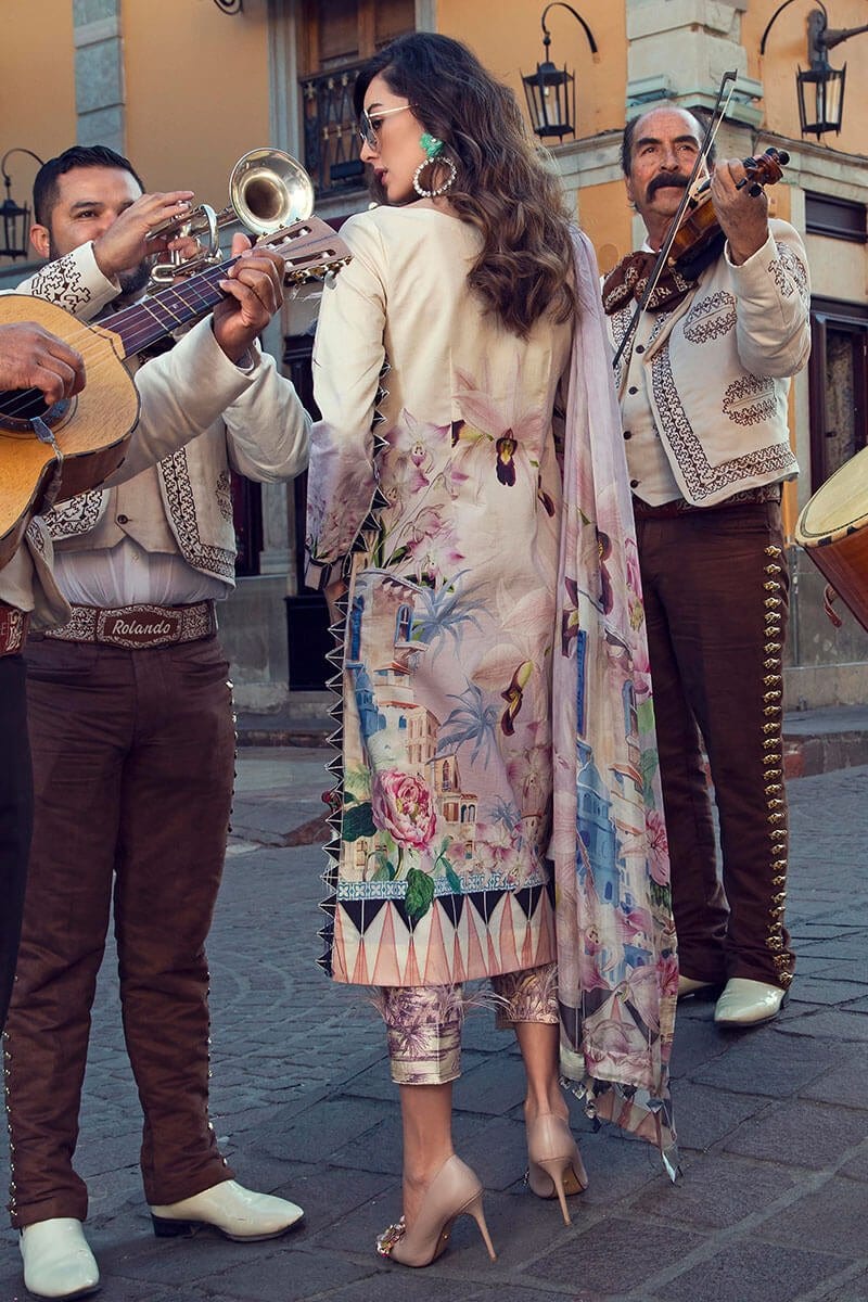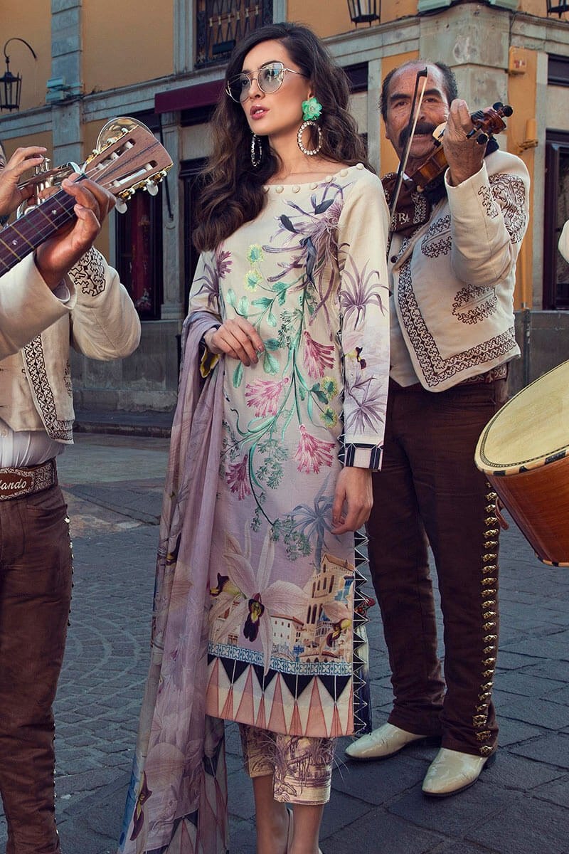 Fabric: Digital print embroidered front Digital print back and sleeve Digital print pure silk dupatta Dyed trouser Embroidered trouser border Embroidered finishing for shirt Buttons for embellishment (11) |