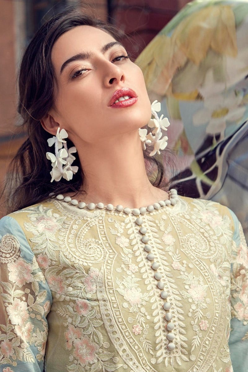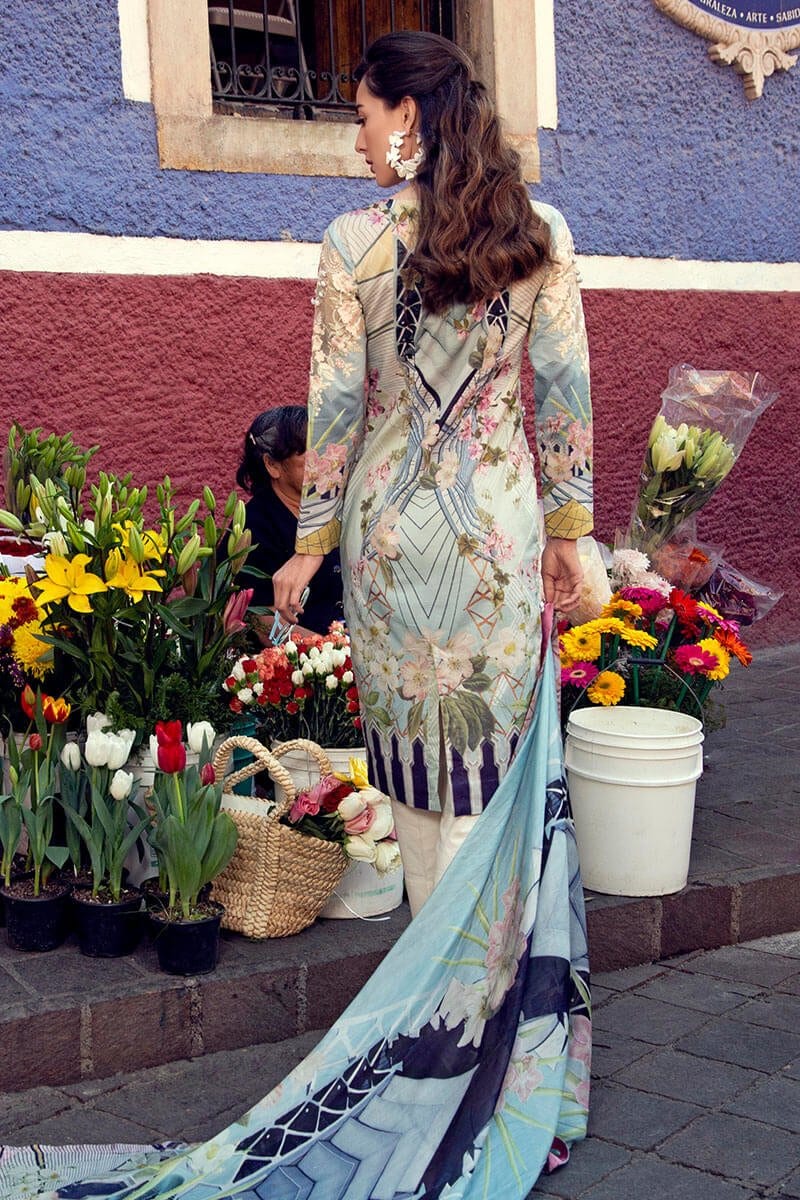 Fabric: Digital print front, back and sleeves Digital print pure silk dupatta Dyed trouser Embroidered hem border Embroidered neckline Embroidered patches for sleeves Buttons for embellishment (30) |