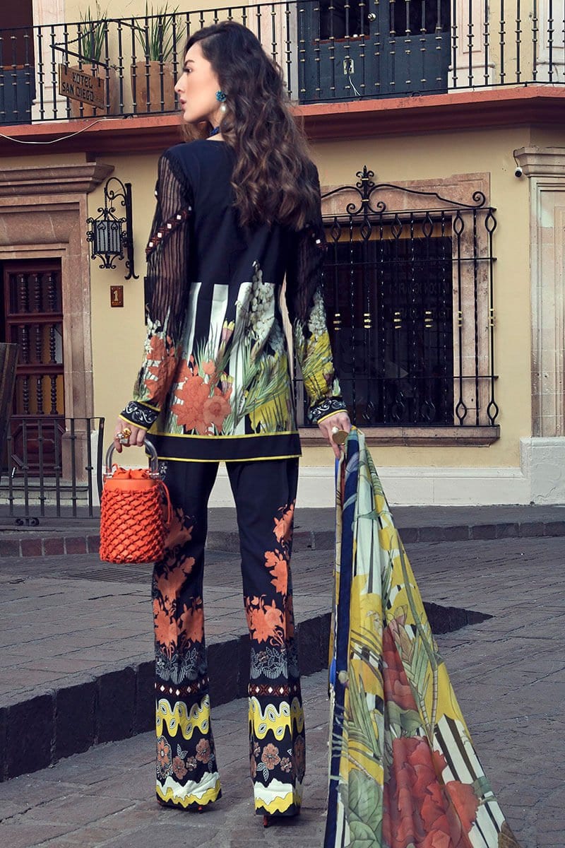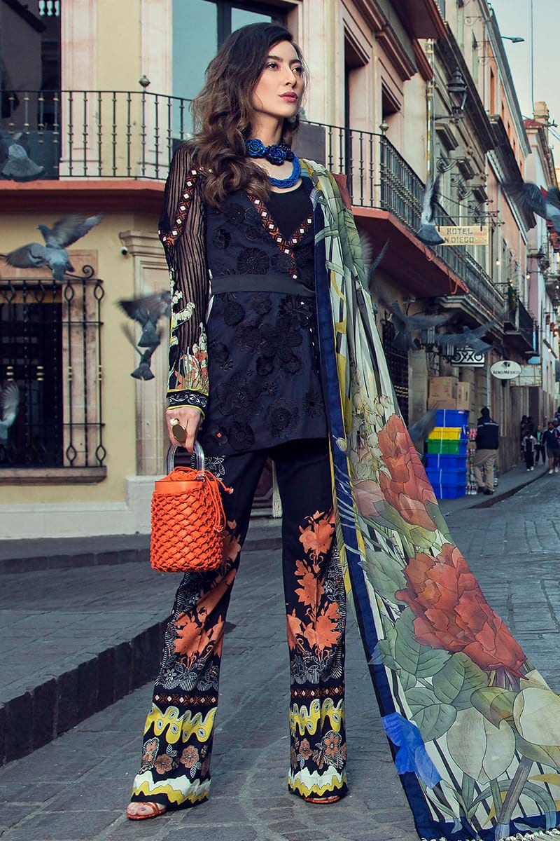 Fabric: Chikan embroidered front Digital print back and sleeves Digital print pure chiffon dupatta Digital print trouser 3D flowers in different shapes Embroidered finishing for shirt and trouser Embroidered organza for sleeves |