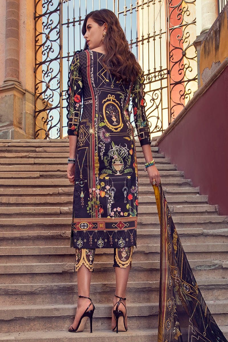 Fabric: Digital print chikan embroidered front Digital print back and sleeves Digital print pure chiffon dupatta Dyed trouser Embroidered finishing for shirt Embroidered trouser border |