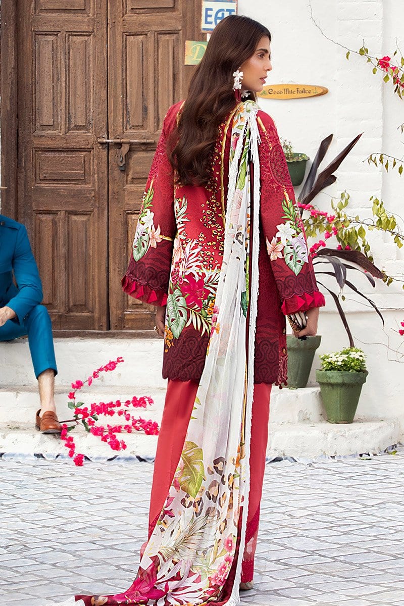 Fabric: Digital printed and embroidered front Digital printed back and sleeves Digital print pure chiffon dupatta Dyed trousers Embroidered patches for sleeves (2) Embroidered border for hem Embroidered border for trousers 3D embroidered flowers for shirt Buttons for finishing (red) Pearls for 3D flowers |