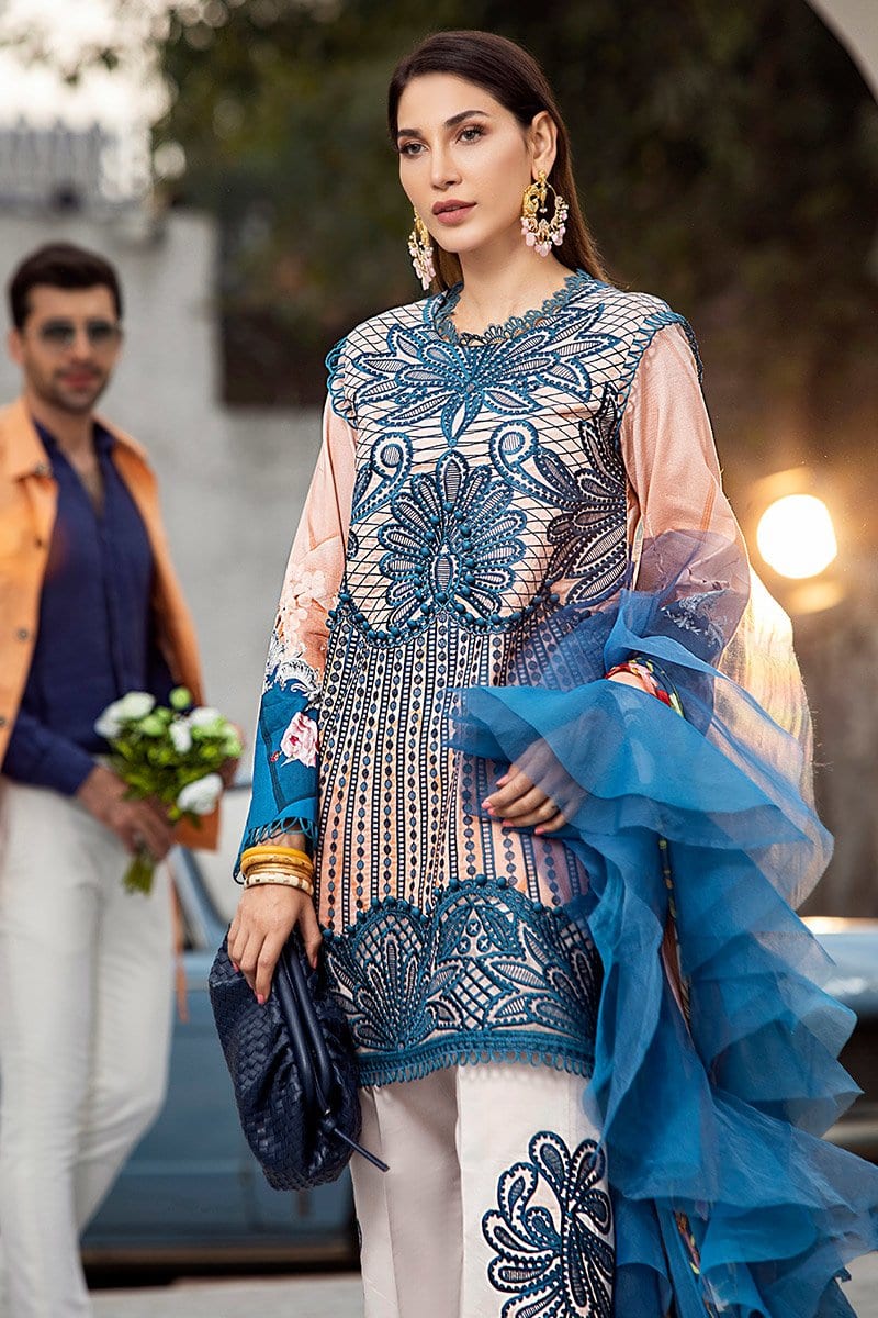 Fabric: Digital printed and embroidered front Digital printed back and sleeves Digital print pure chiffon dupatta Dyed trousers Embroidered patches for trouser (2) Embroidered border for hem Embroidered lace for trouser Bottons (blue) |