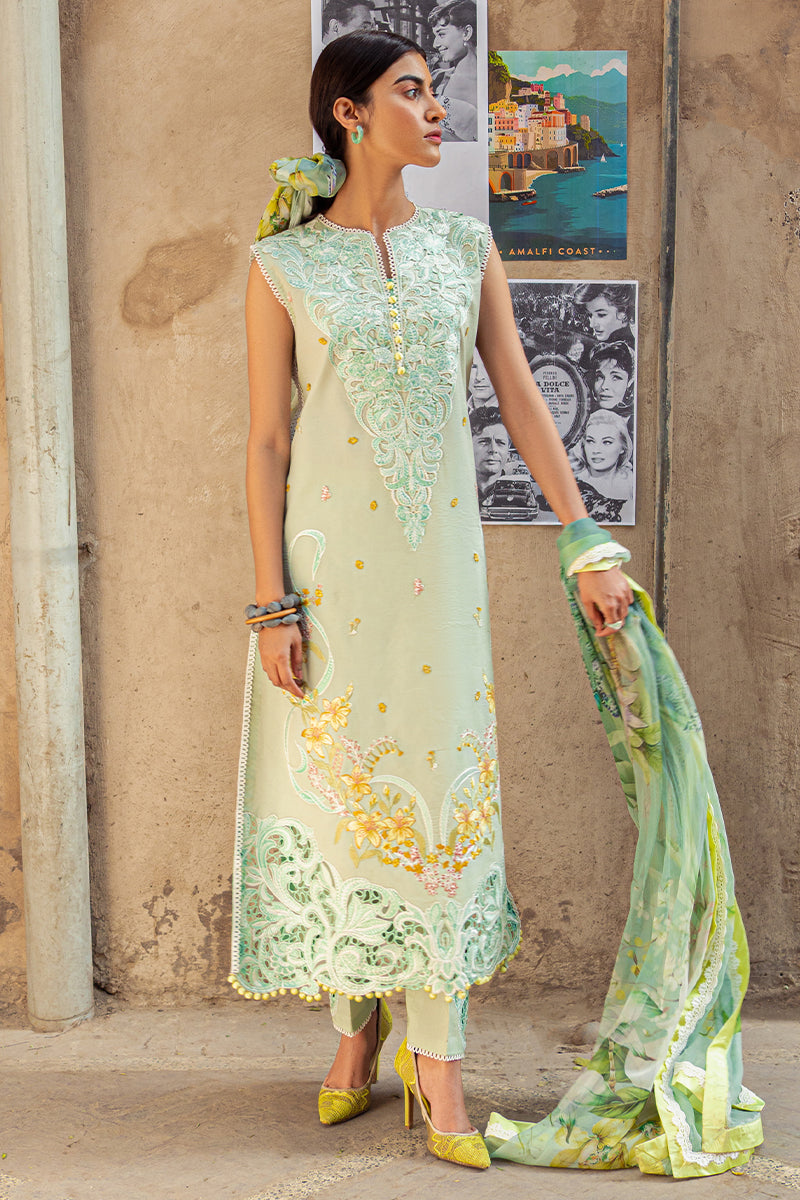 BIANCA; a summer state of affair on a green tone. Featuring an embroidered silhouette and finishing off the look with a signature dupatta giving a touch of traditional yet modern sensibilities.