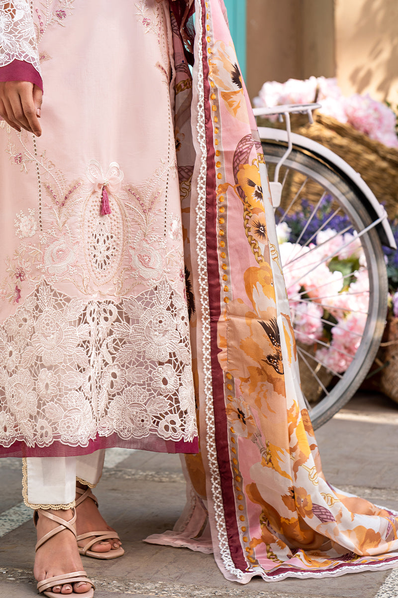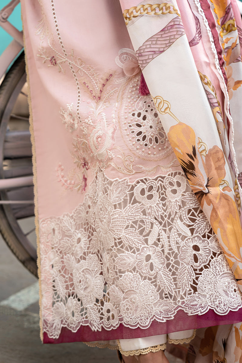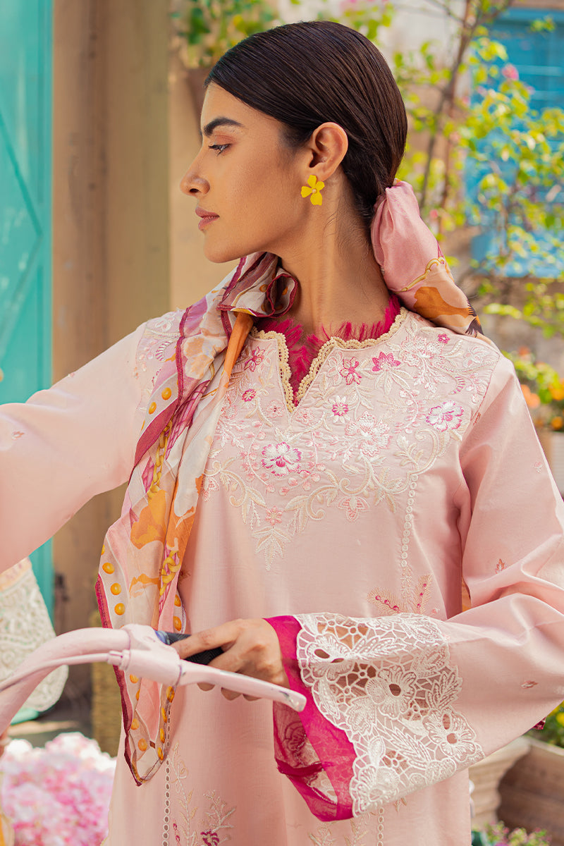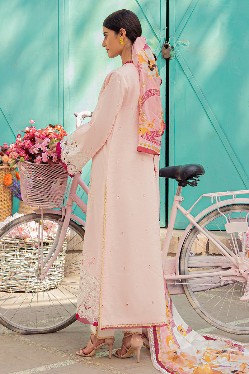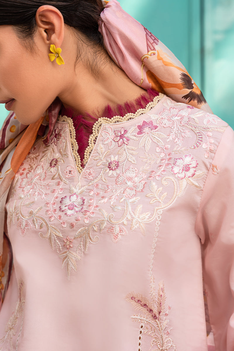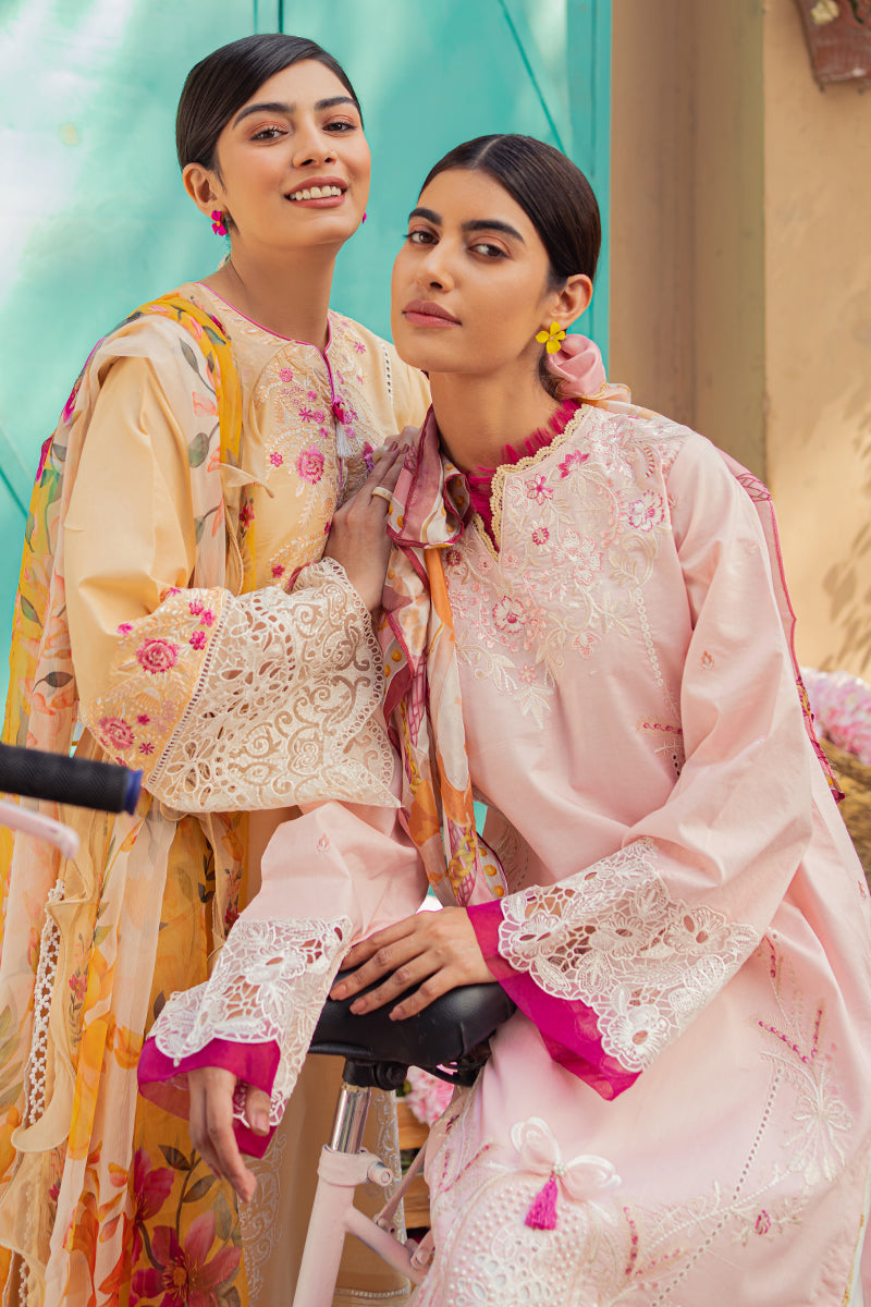 Lara: "Sweet and sophisticated, this baby pink Chikan embroidered shirt with crochet lace details and handmade tassels is paired perfectly with a digital print silk dupatta and dyed cotton trouser for a feminine and elegant summer look."