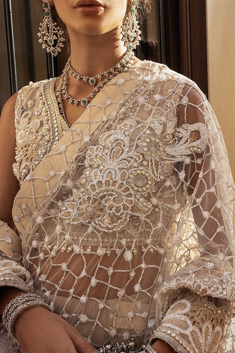 Fabric:Double sequinned net for lehnga/saree palu Sequinned net for dupatta/saree Pani embroidered, sequinned and hand embellished organza for front yoke Dyed organza for back yoke Embroidered, sequinned and pani embellished border for lehnga/saree Embroidered, sequinned and pani embellished sleeves on organza Pani embroidered and sequinned motifs for lehnga/saree Raw silk lining for lehnga/saree Cotton silk undershirt Kiran lace for dupatta 3D sequinned flowers for lehnga/saree Drops for shirt finishing |
