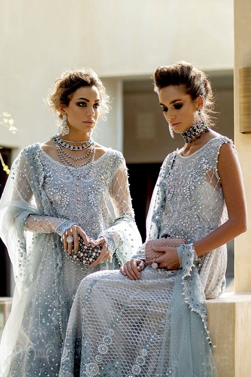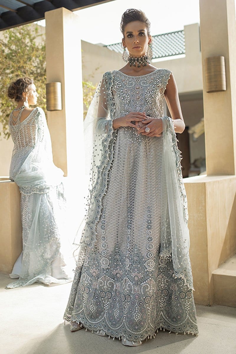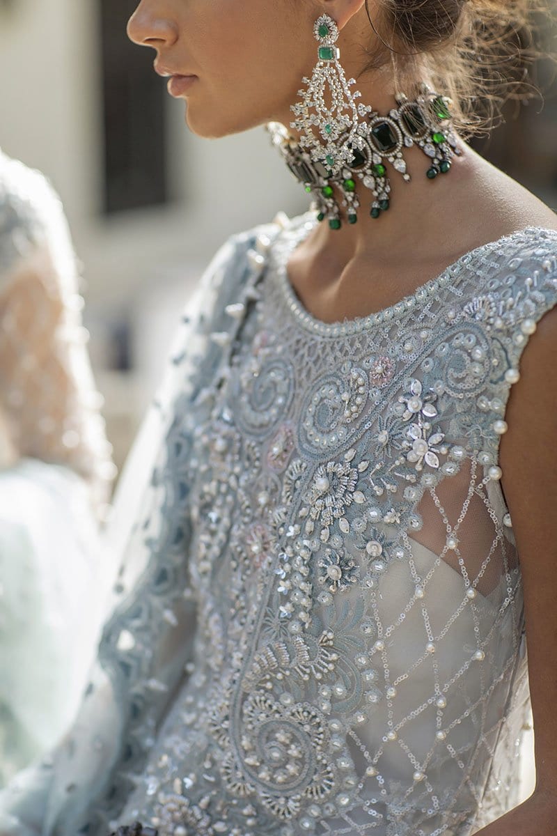 Fabric:Embroidered, sequinned and pani embellished front on net Embroidered, sequined and pani embellished back on net Sequinned and pearl embellished sleeves on net Embroidered and hand embellished neckline Embroidered, sequinned and pani embellished border for front and back Embroidered, sequinned and pani embellished neckline for back Embroidered and pani embellished net dupatta Jamawar Lehnga Cotton silk undershirt Pearls for finishing |