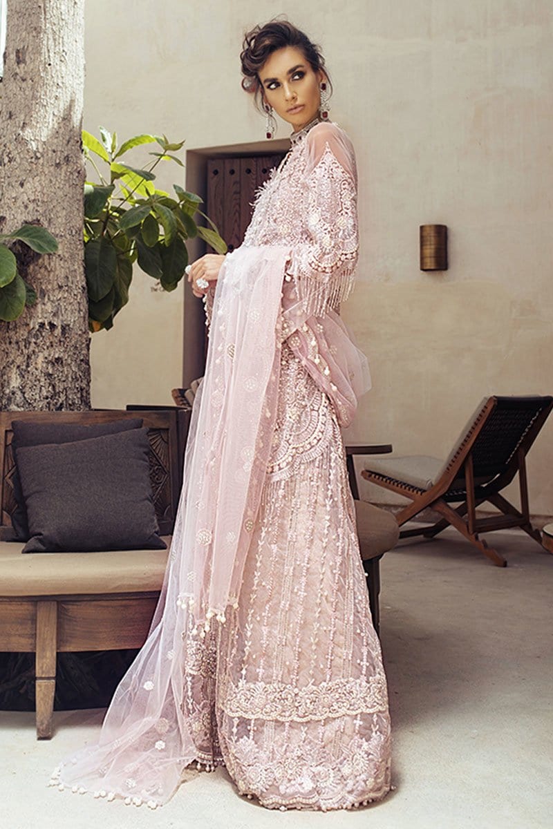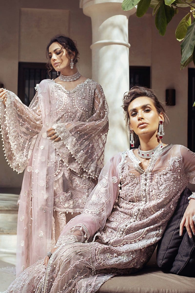 Fabric:Embroidered, sequinned and pani embellished front on net with handwork Embroidered, sequinned and pani embellished back on net Embroidered, sequinned and pani embellished shirt extension on net Dyed net for sleeves Embroidered, sequinned and pani embellished sleeves motifs Pani embroidered and sequinned border for shirt front and back Pani embroidered and sequinned border for front and back daman and sleeves Sequinned and pani embroidered finishing lace Dyed Jamawar Lehnga Pani embroidered net dupatta Cotton silk undershirt Diamante studded buttons for front Drops for shirt and dupatta finishing |