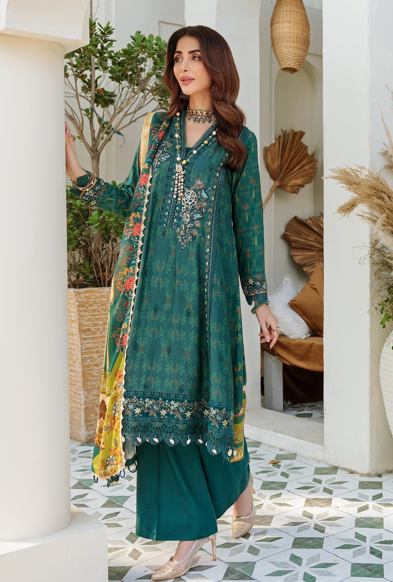 Front: Shiffli embroidered digital printed linen