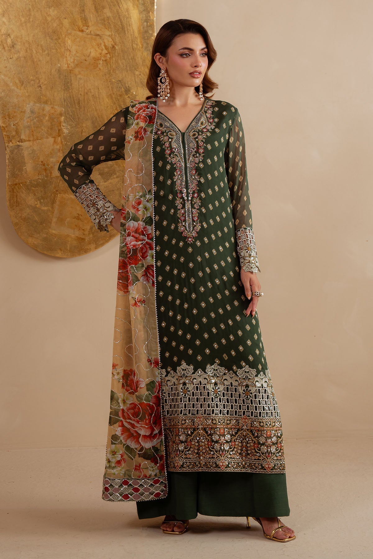 Fabric: Embroidered And Printed Chiffon Front With Stone Work Printed Chiffon Back Printed Chiffon Sleeves Embroidered Organza Sleeve Border Embroidered Organza Front And Back Daman Patch Embroidered Organza Front And Back Border Embroidered And Printed Chiffon Dupatta Embroidered Organza Dupatta Pallu Border Dyed Inner Dyed Trouser |