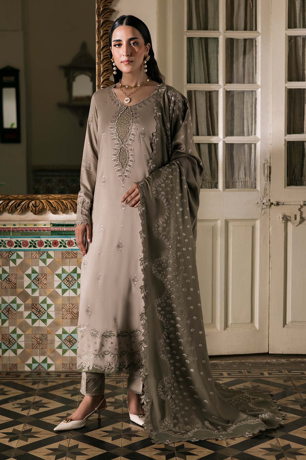 Summary: Exude sophistication in this stunning grey Pakistani suit from the Nureh Fall/Winter collection. This unstitched ensemble is crafted from premium Marina Twill, a fabric known for its warmth and graceful drape, making it perfect for colder seasons. The kameez is adorned with delicate, intricate embroidery around the neckline, cuffs, and along the hem, lending it an air of formal elegance. This beautiful ethnic wear is an ideal choice for evening gatherings, dinner parties, and formal occasions, offering a chic and classic look. Invest in this timeless piece of Pakistani formal wear for your winter wardrobe.