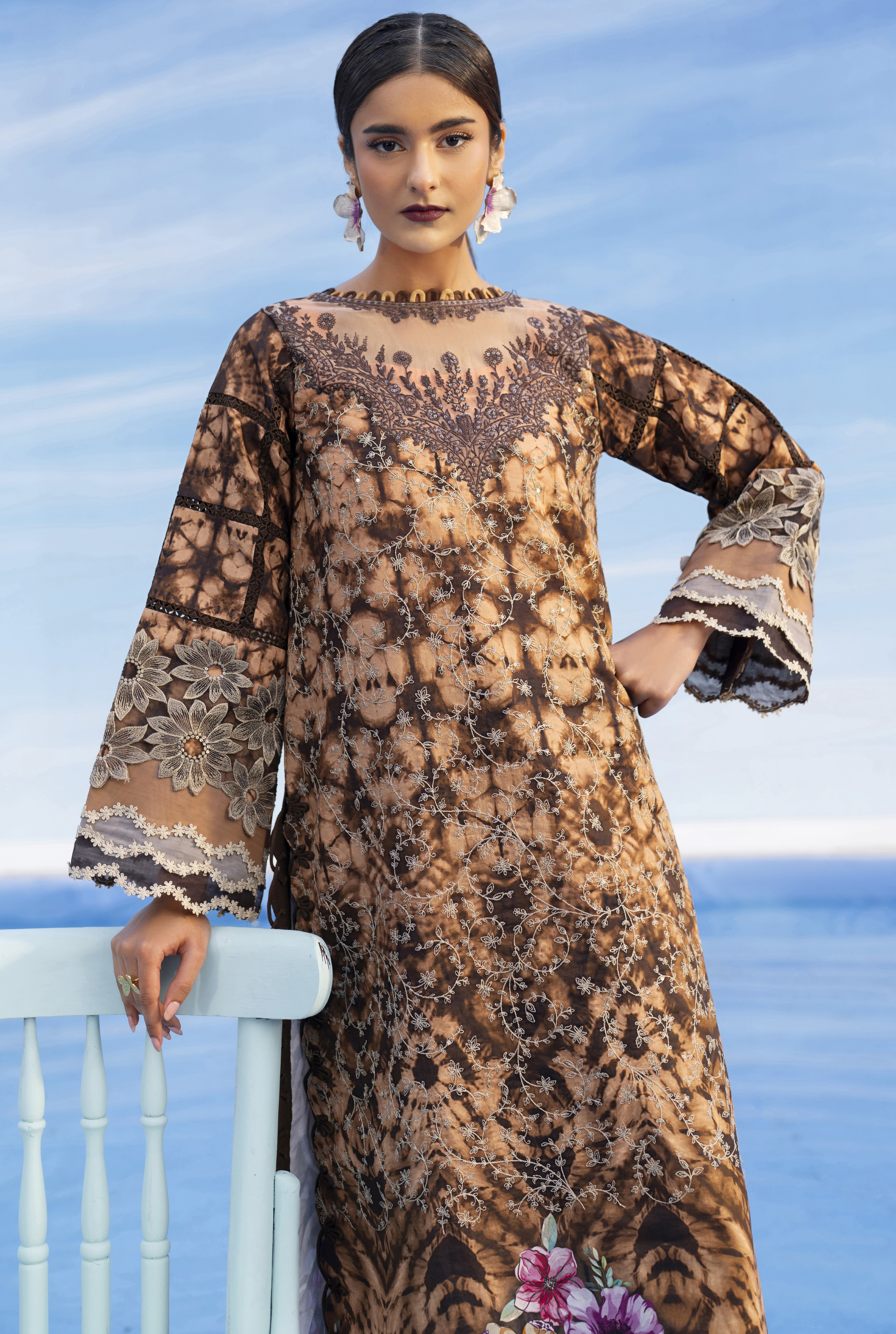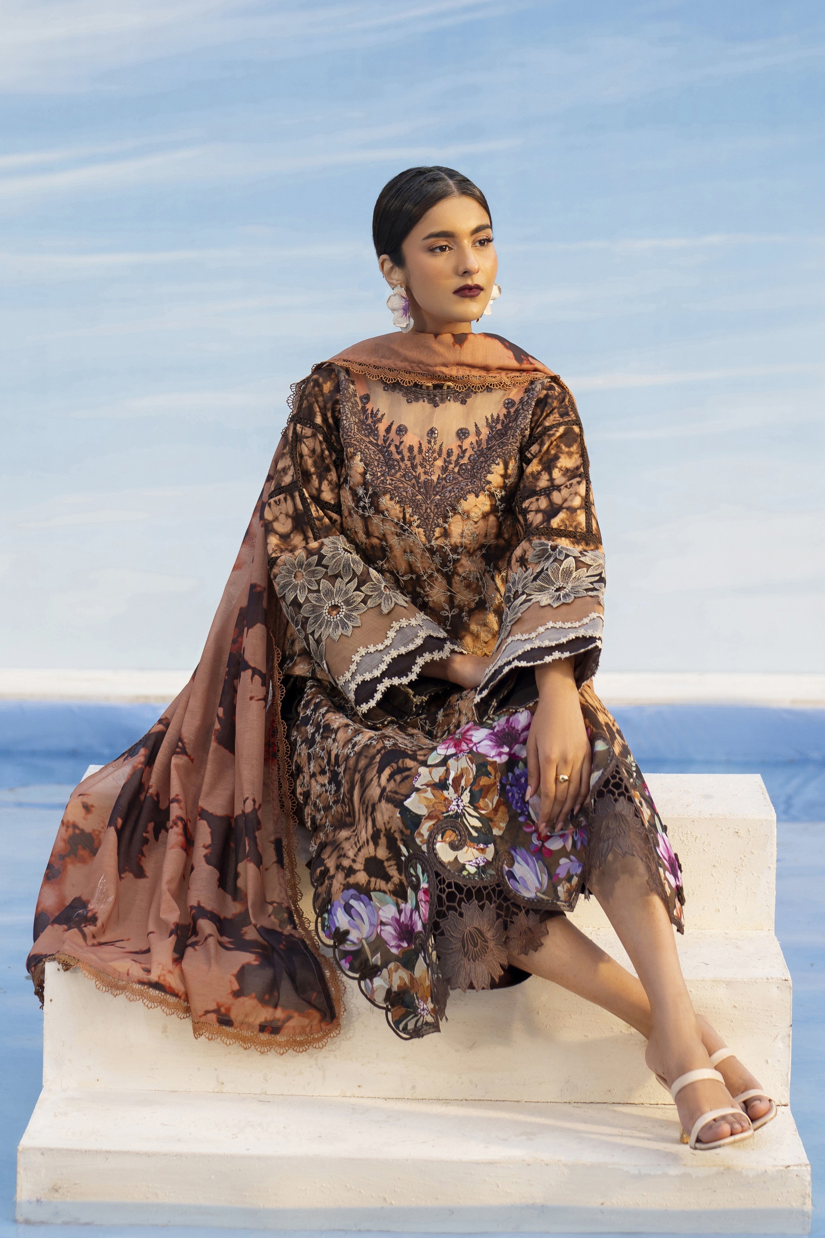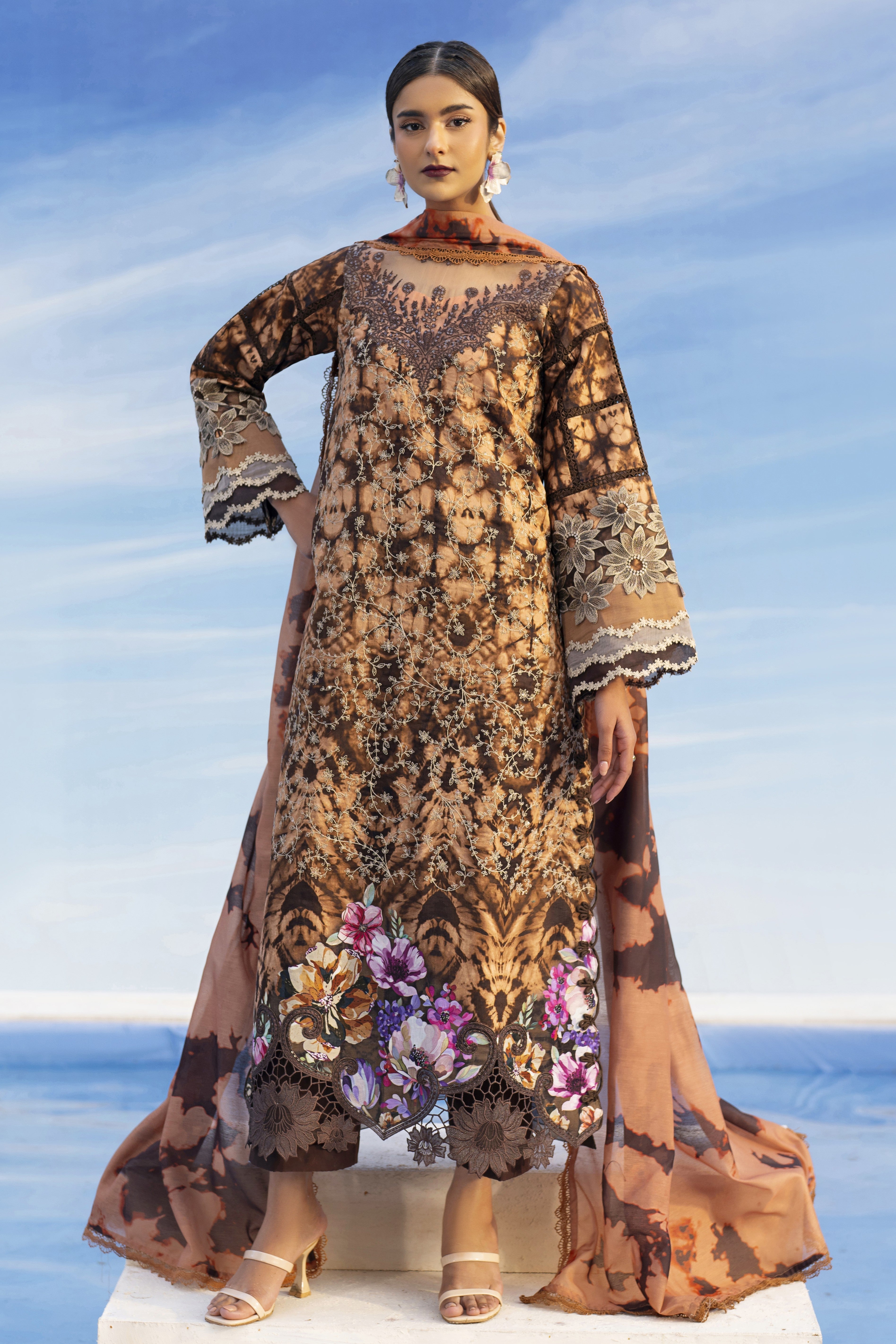 Summary: Step into summer elegance with this stunning Brown Parishay Ivy Bloom Pakistani Lawn Suit. Crafted from premium breathable Lawn fabric, the main kameez showcases a chic tie-dye inspired print mingled with intricate embroidery on the neckline and borders, perfect for the Spring/Summer heat. The ensemble is completed with a feather-light Printed Voile Dupatta and comfortable Cambric trousers. Vibrant floral accents at the hem elevate this unstitched dress material, making it an impeccable choice for Eid festivities, garden parties, or sophisticated daily wear. A true embodiment of modern Pakistani fashion, this outfit blends traditional craftsmanship with contemporary style. Shop this exquisite ethnic wear online to make a statement this season.