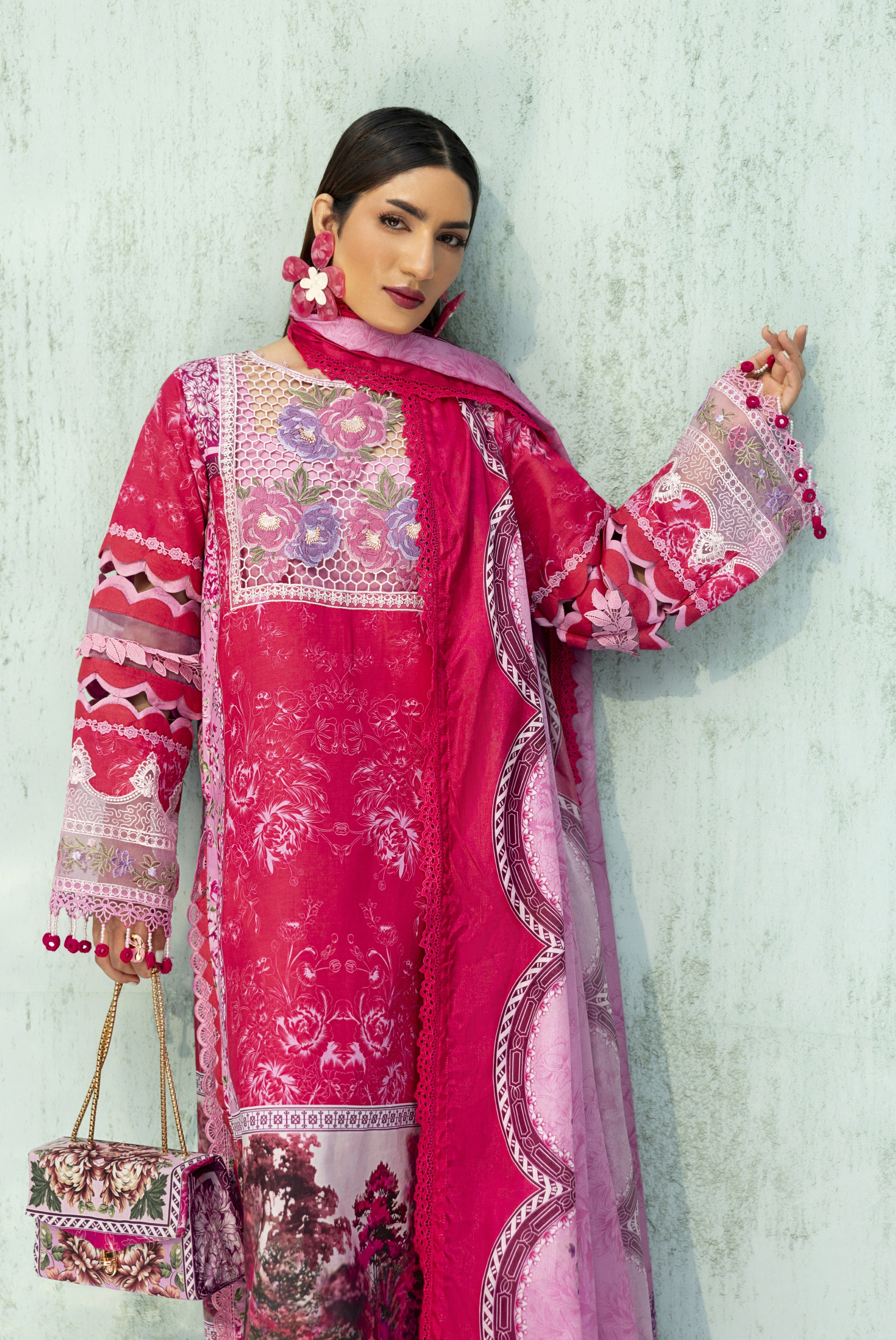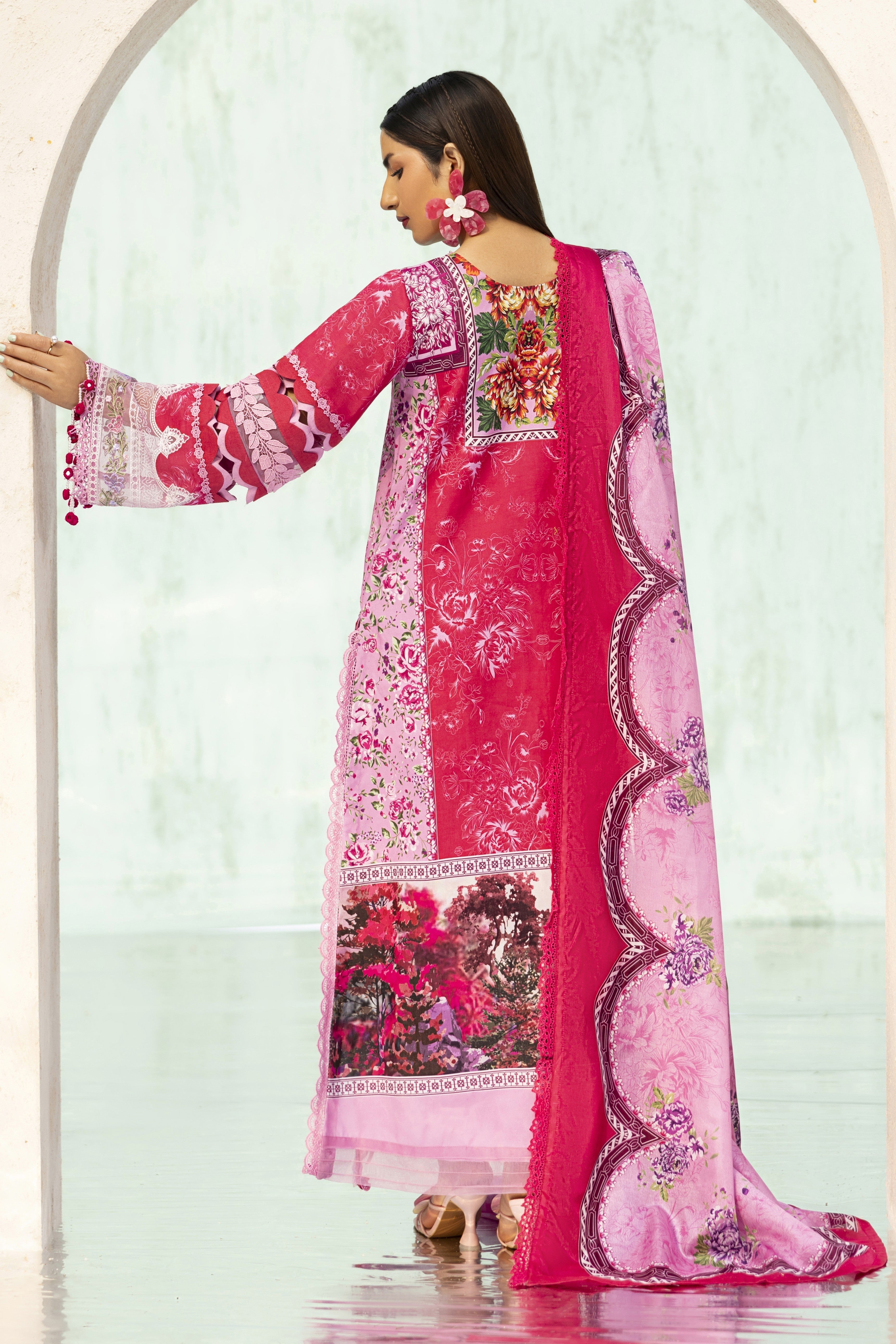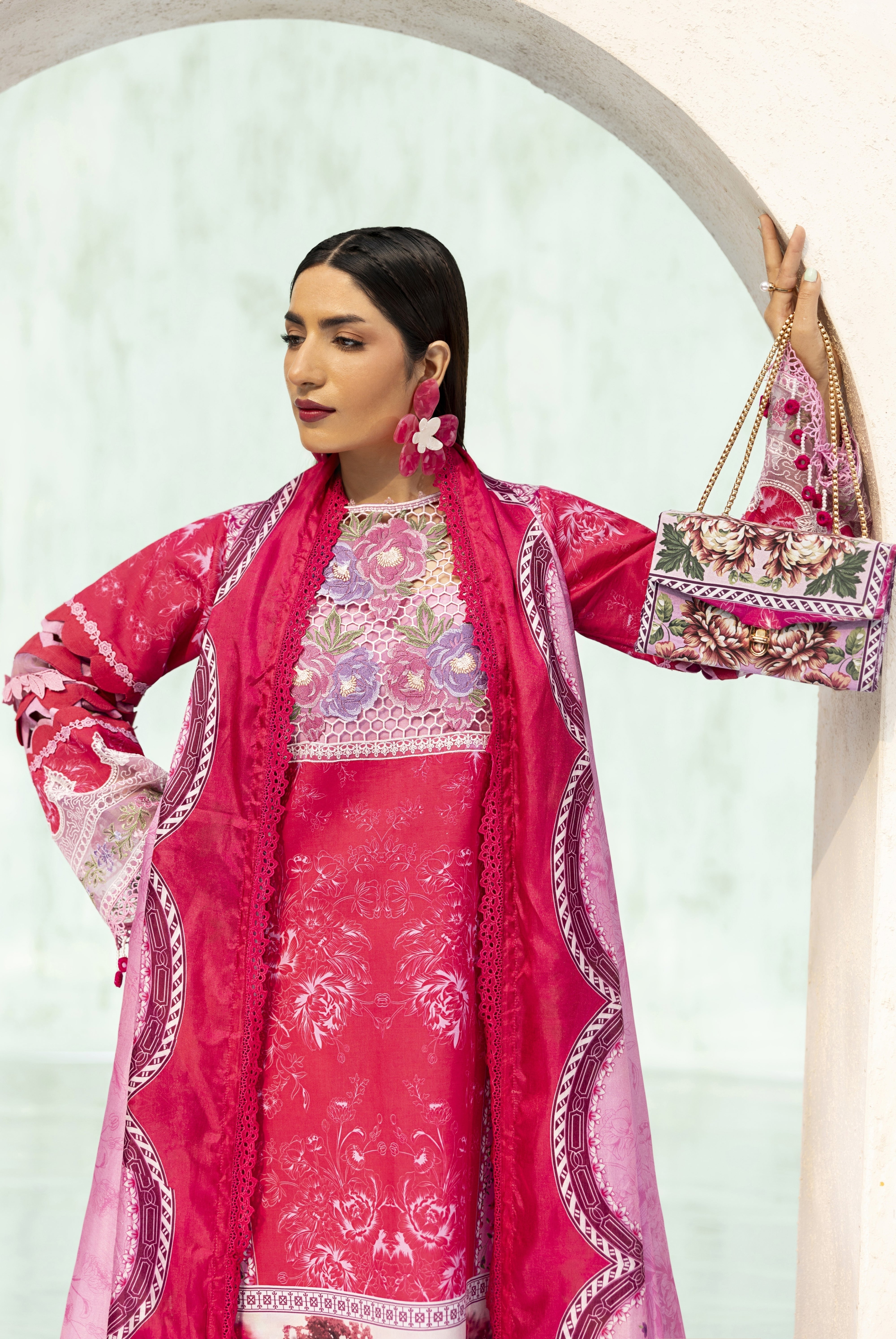 Summary: Elevate your summer wardrobe with this exquisite Pink Pakistani Lawn Suit from the Parishay Ivy Bloom collection. The ensemble features a vibrant digital printed lawn shirt showcasing a stunning fusion of magenta and soft pink floral motifs, enhanced by an intricate embroidered neckline and borders. Paired with a luxurious printed silk dupatta that adds a touch of sophistication, this outfit is designed for breathable comfort and style. Ideal for Eid celebrations, summer parties, or festive gatherings, this unstitched dress material offers authentic ethnic charm. Shop this chic Pakistani dress online to make a graceful statement this season.
