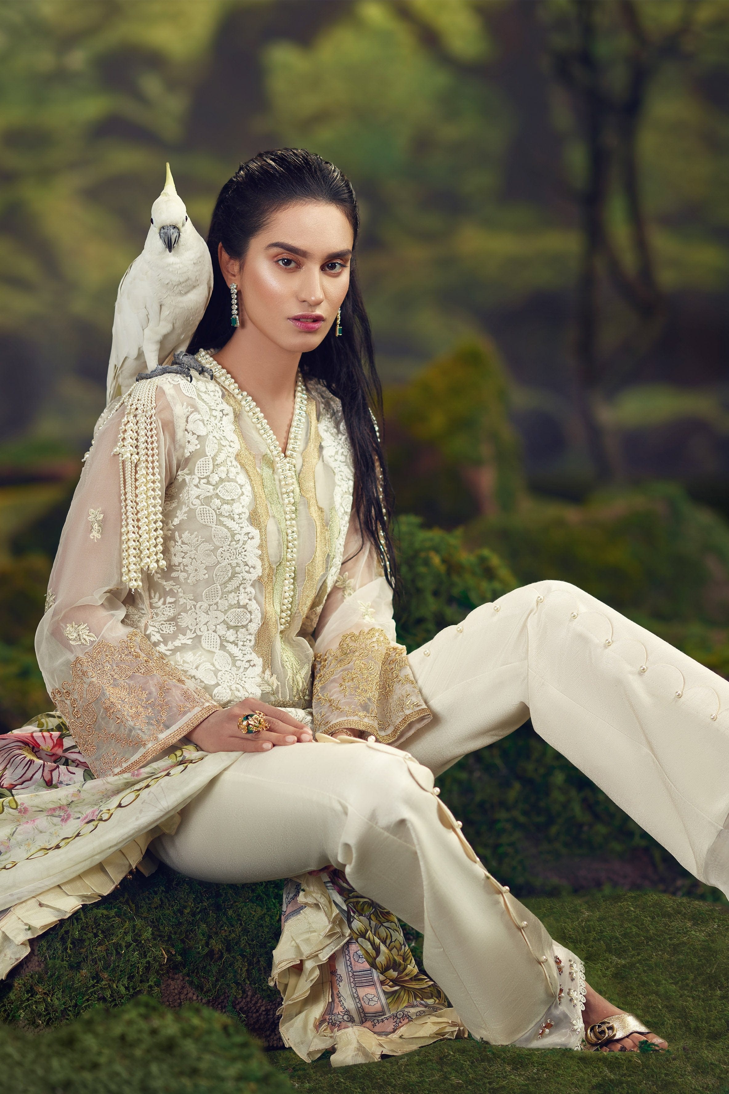 Fabric: Organza Embroidered Center Panels for Front & Back Organza Embroidered Front & Back Panels Handmade Embellished Neckline Dyed Shirt Lining Embroidered Organza Sleeves Digitally Printed Silk Dupatta Plain Raw Silk Trouser and Handmade Organza Embellished Trouser Patches |