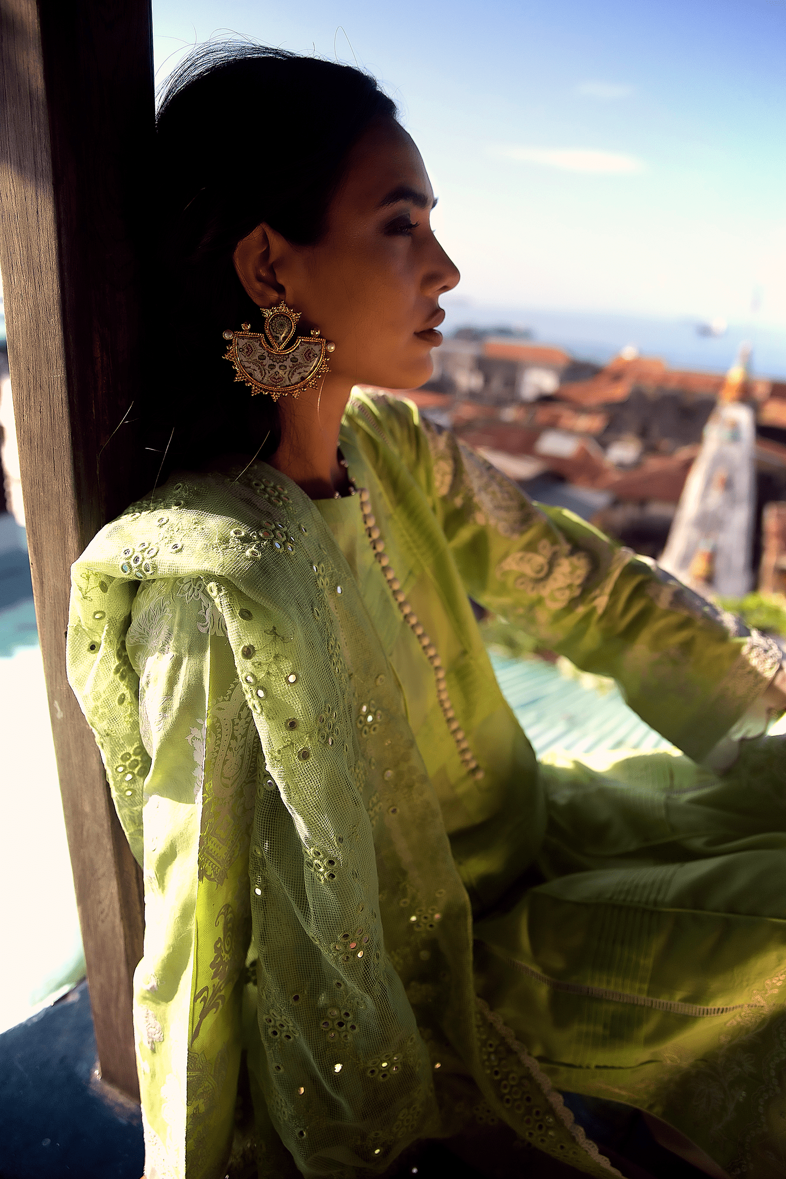 Fabric: Semi Stitch Front Embroidered Motif for Front Embroidered Bordered for Front & Back Embossed Printed Back Embossed Printed Sleeves Dyed Trouser Sheesha Embroidered Net Dupatta |