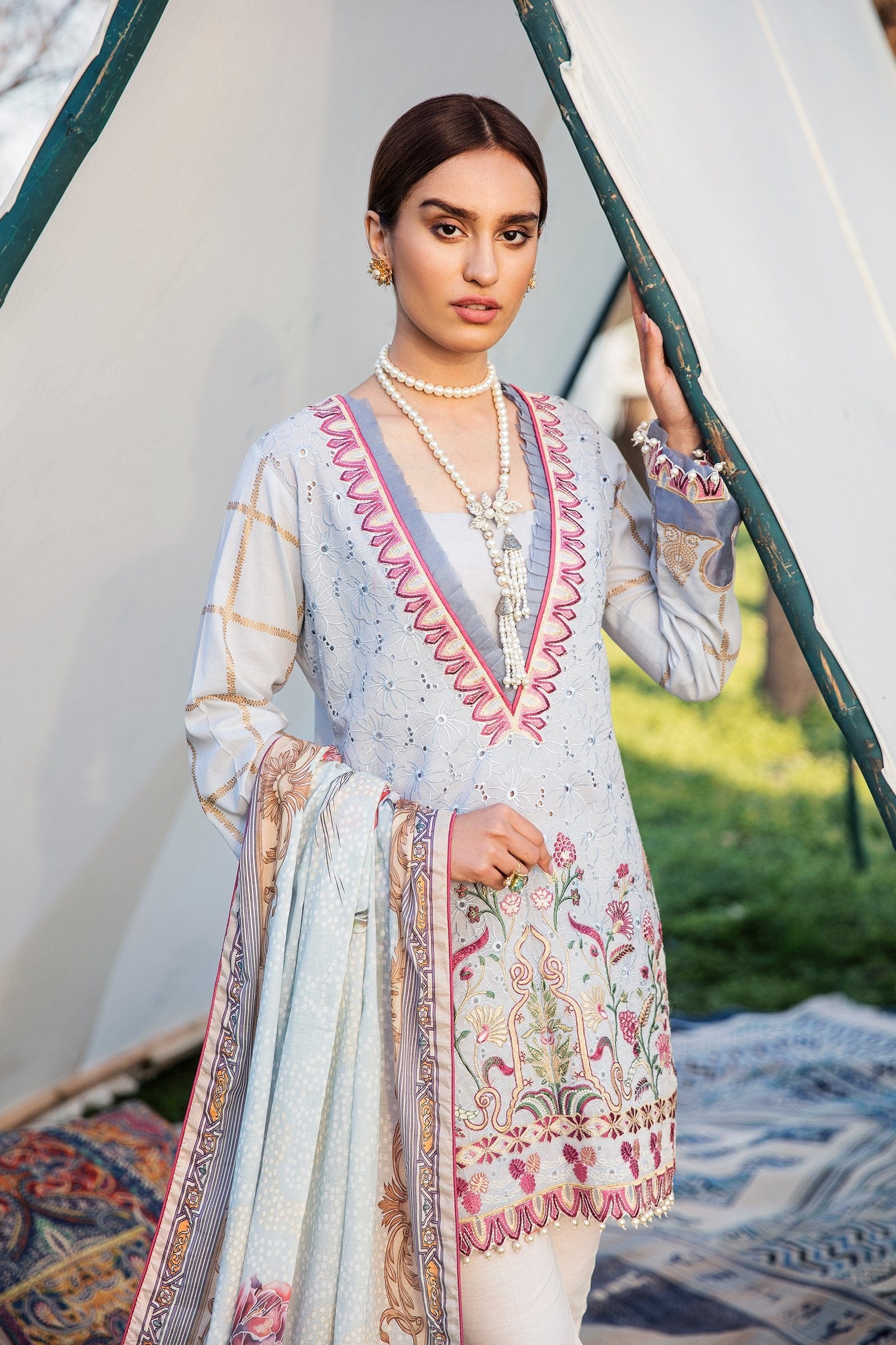 Fabric: Schiffli Embroidered Front Digital Printed Back Digital Printed Sleeves Digital Printed Egyptian Lawn Dupatta Dyed Trouser Embroidered Front Lace Embroidered Hem Embroidered Border Lace |