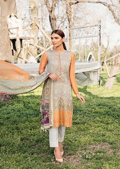 Fabric: Schiffli Embroidered Front Digital Printed Back Plain Sleeves Digital Printed Chiffon Dupatta Dyed Trouser |