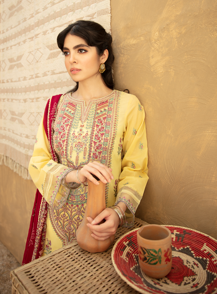 Fabric: Shirt Embroidered front Embroidered Neckline Embroidered Sleeves Embroidered Sleeves lace Embroidered Front Border Block Printed Back Dupatta Block Printed Chiffon Dupatta Trouser Plain Trouser |