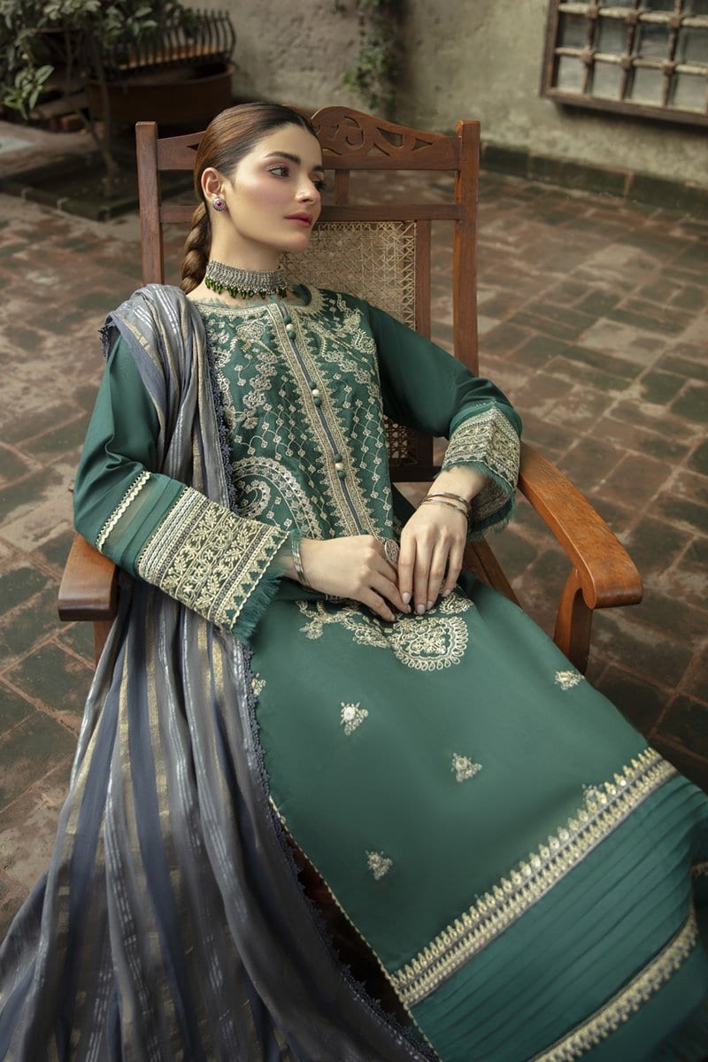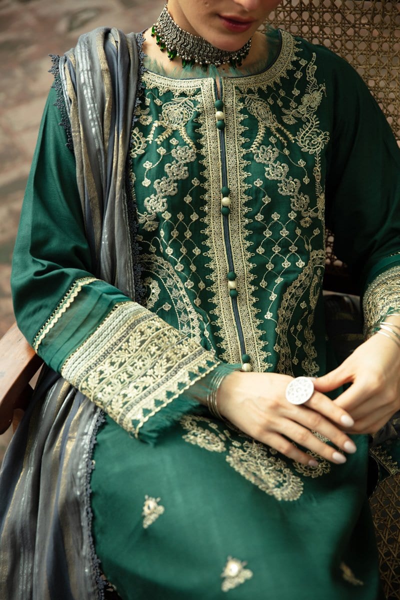 Fabric: Shirt Sheesha Embroidered (Front) Embroidered Border (Front & Back) Plain Fabric (Back & Sleeves) Embroidered Border for sleeves plain organza (Front & Back) Dupatta Hand loomed Jacquard Trouser Plain Trouser Embroidered lace |
