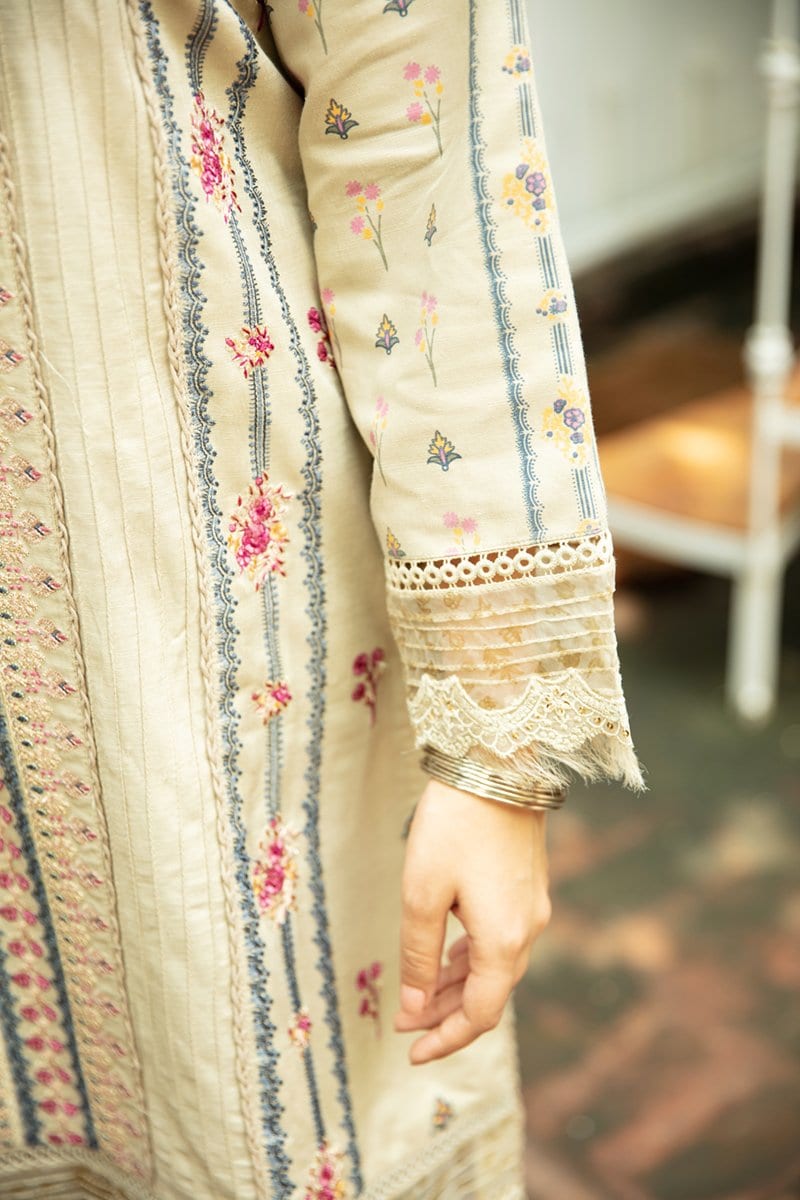 Fabric: Shirt Embroidered (Front) Embroidered lace (Front) Embroidered border (Front) Block printed organza border (Front & Sleeves) Block Printed (Back & Sleeves) Embroidered lace (Sleeves) Shawl Block Printed shawl Embroidered Motifs Trouser Plain Trouser |