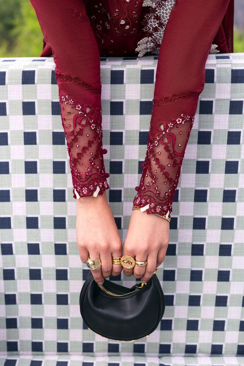 Summary: The Qalamkar Qlinekari Lawn – DC-06 Aila is a stunning Pakistani suit perfect for special occasions. This unstitched three-piece ensemble features a beautifully embroidered maroon lawn shirt as its centerpiece. The intricate embroidery adorns the front panels, sleeves, and borders, creating a captivating design. The shirt features a plain back, providing a pleasing contrast to the detailed front. Complementing the shirt is a luxurious chiffon dupatta in a matching maroon shade. The dupatta is heavily embroidered with a four-sided border, adding an extra touch of elegance to the overall look. The suit is completed with plain cotton trousers, offering comfort and versatility. This design is perfect for those who love detailed embroidery and rich color palettes, making it an excellent choice for parties or other festive occasions. The lightweight and breathable lawn fabric make it ideal for spring or summer events. Express your unique style and grace with this exquisite Pakistani suit. This Qalamkar original design is a must-have for any fashion-conscious woman.