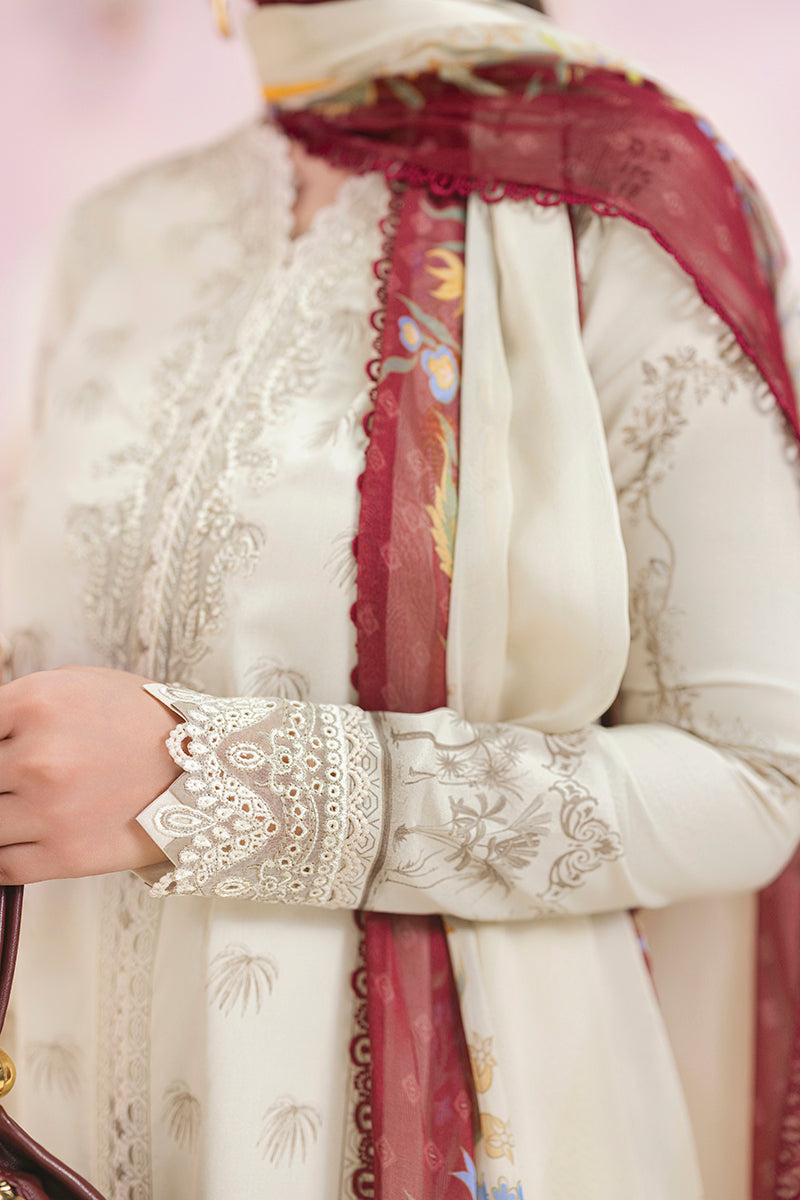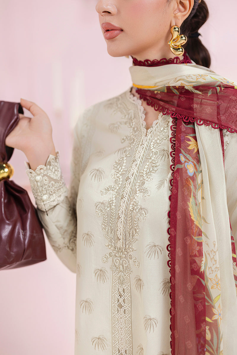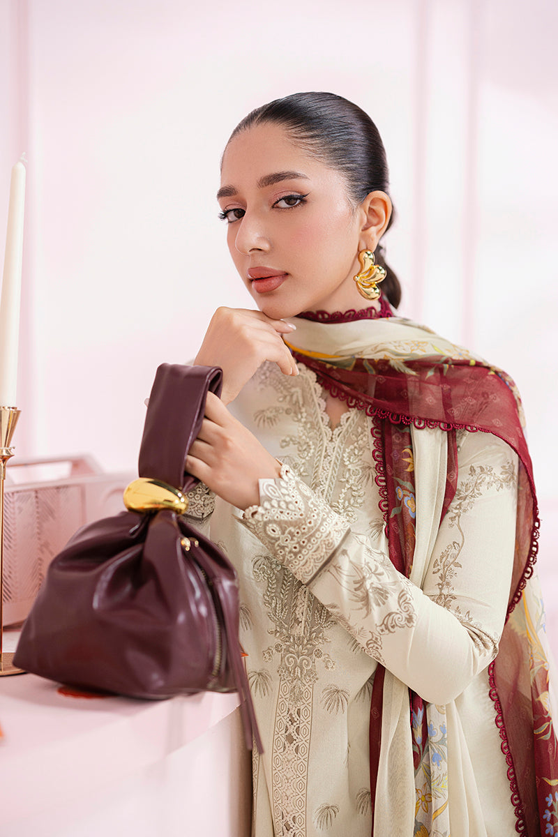 Summary: Embrace effortless style with the Qalamkar QPrints Lawn Vol-2 – EM-06 (B) TALIA. This exquisite Pakistani suit showcases an off-white lawn shirt adorned with delicate Chikankari embroidery on the neckline, hem, and sleeve borders. The intricate details add a touch of traditional charm to the contemporary design. The digital print on the shirt adds a subtle yet captivating visual element, while the lightweight and breathable lawn fabric ensures comfort throughout the day. This unstitched three-piece suit includes a digitally printed chiffon dupatta with vibrant hues and a dyed cotton trouser with a stylish digital print patch, offering endless styling possibilities. Perfect for daily wear, this Qalamkar creation blends classic and modern aesthetics seamlessly, making it a must-have addition to your wardrobe.