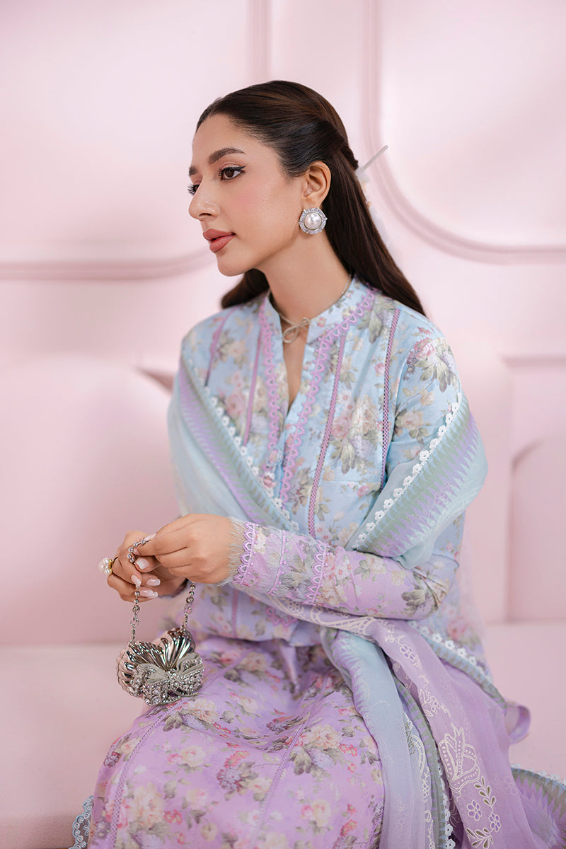 Summary: The Qalamkar QPrints Lawn Vol-2 EM-08 (B) VERA is a beautiful and stylish Pakistani suit perfect for daily wear during the spring/summer season. The main attraction of this ensemble is the eye-catching digitally printed lawn shirt in shades of blue and purple. The floral print lends a fresh and feminine touch, making it a versatile choice for various occasions. This unstitched three-piece suit includes a digitally printed lawn shirt, a complementing digital and block printed chiffon dupatta, and a dyed cotton trouser. The shirt features delicate embroidered detailing on the border and lace embellishments, adding a touch of elegance to the overall design. The lightweight and breathable lawn fabric ensures comfort, while the chiffon dupatta drapes gracefully. The dyed cotton trouser provides a comfortable and practical bottom, completing this chic and easy-to-wear outfit. This suit offers both comfort and style, making it a perfect addition to your wardrobe for casual outings or everyday elegance.