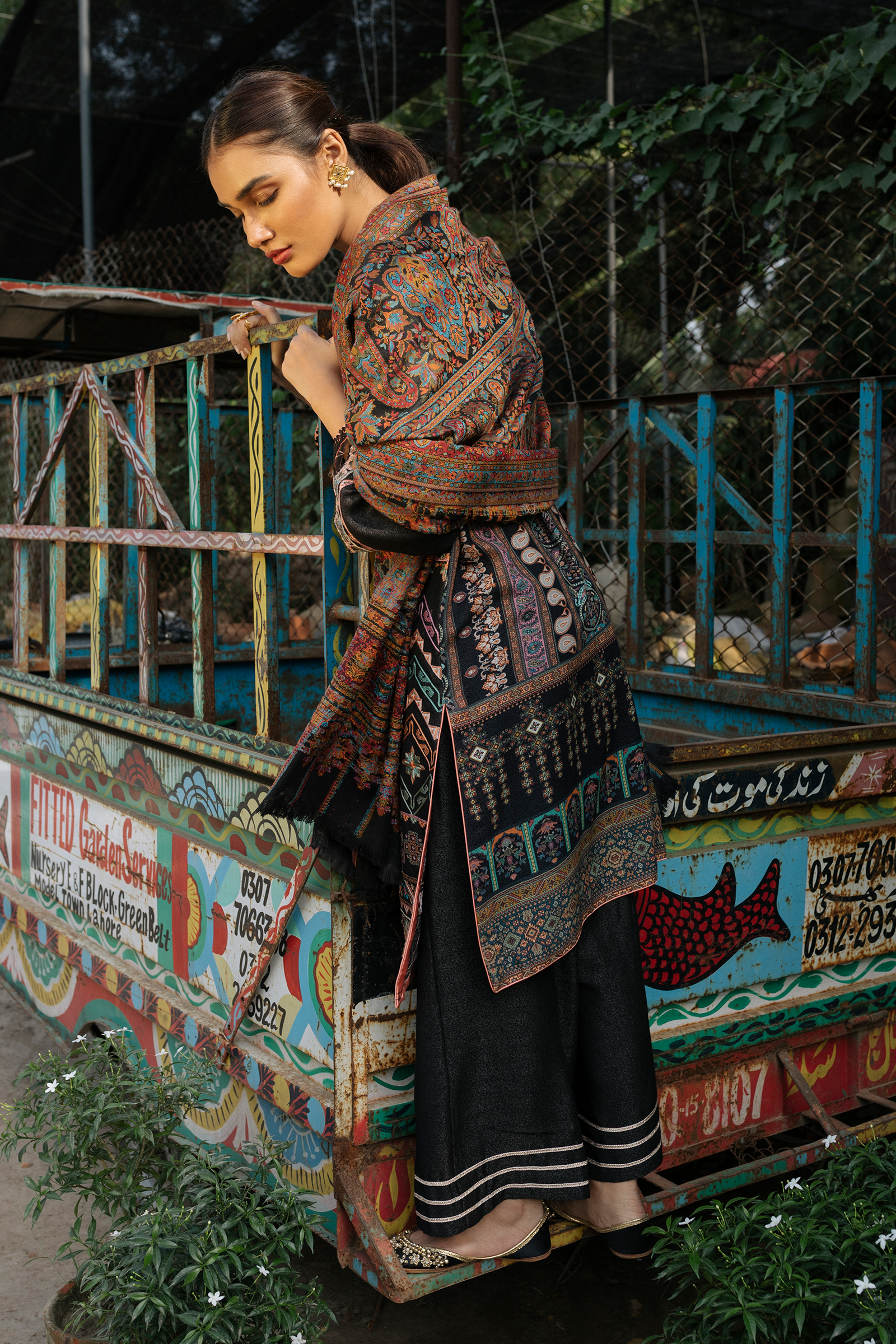 Fabric: Cross Stitch Embroidered Front Digital Printed Back Cross Stitch Embroidered Sleeves Hand Weaved Wool Shawl Dyed Trouser Embroidered Lace for Front and Sleeves |