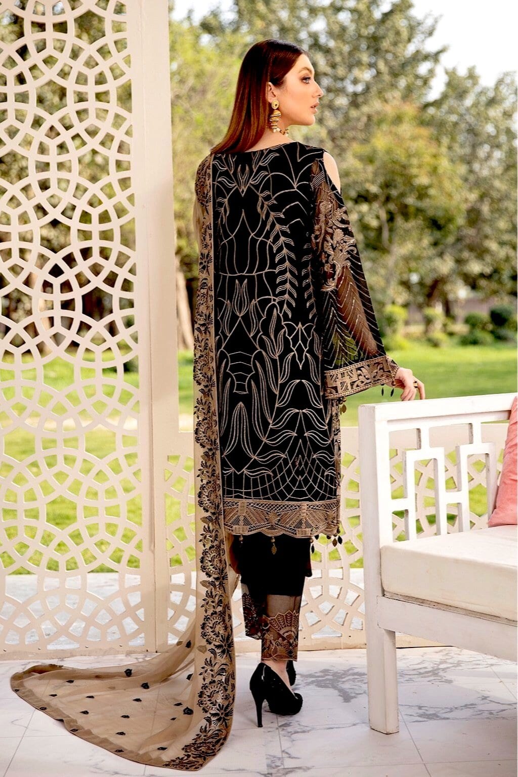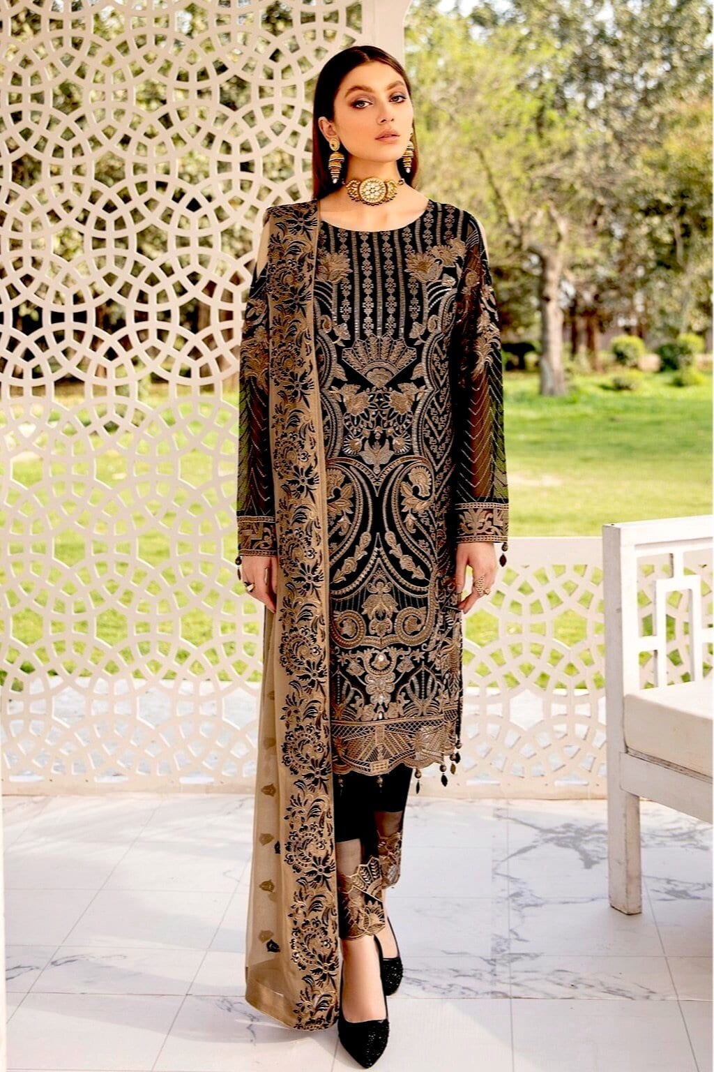 Fabric: Embroidered Chiffon front with sequins Embroidered Chiffon back Embroidered Chiffon sleeves Embroidered tissue sleeves lace Embroidered tissue ghera lace Embroidered chiffon dupatta – 2.50 Meter Raw silk trouser – 2.5 Meter Embroidered tissue trouser lace |