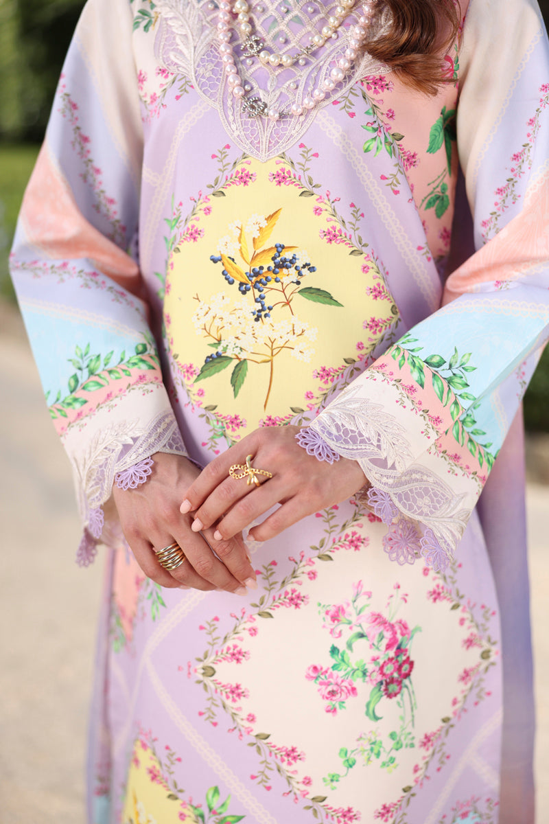 Summary: Embrace summer elegance with this stunning lavender Pakistani suit from Rang Rasiya's 'Acacia' collection. This unstitched dress is crafted from premium printed lawn, ensuring a light and breathable feel for the warmer months. The kameez features a beautiful print, elegantly enhanced with exquisite organza embroidery on the neckline, front border, and sleeves. As a quintessential Pakistani Lawn Dress, its sophisticated design makes it a perfect piece of festive wear. This summer outfit is ideal for Eid gatherings, daytime parties, or formal events, offering a blend of traditional charm and contemporary style.