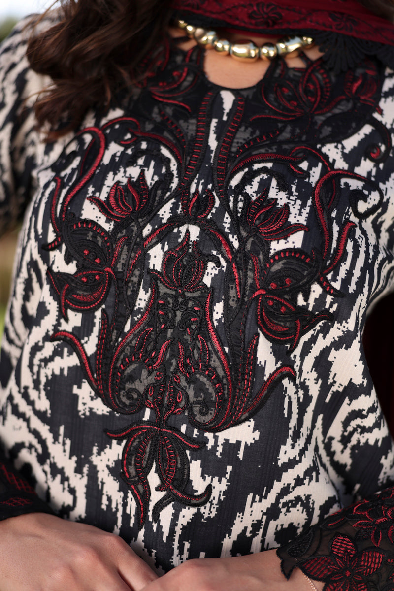 Summary: Step into sophistication with the 'Peony' Pakistani suit from Rang Rasiya's summer collection. This elegant ensemble features a premium lawn kameez with a striking off-white base covered in a bold black print. The design is beautifully enhanced with delicate organza embroidery on the neckline, front hem, and sleeve borders, adding a layer of formal charm. The breathable lawn fabric makes this Pakistani dress a perfect choice for summer festivities. This ethnic wear, with its blend of print and embroidery, is ideal for formal gatherings and Eid celebrations, offering a graceful and contemporary look.