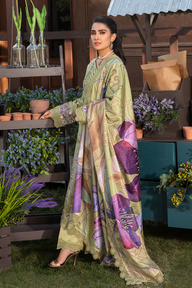Fabric: Embroidered shirt front on dyed lawn 1.25 yard Embroidered shirt sleeve on dyed lawn 0.70 yard Shirt back on dyed lawn 1.25 yard Embroidered shirt sleeve border on dyed organza 45 inch Embroidered shirt front border on dyed organza 33 inch Digital printed woven silk dupatta 2.75 yard Dyed cotton trouser 2.75 yard |