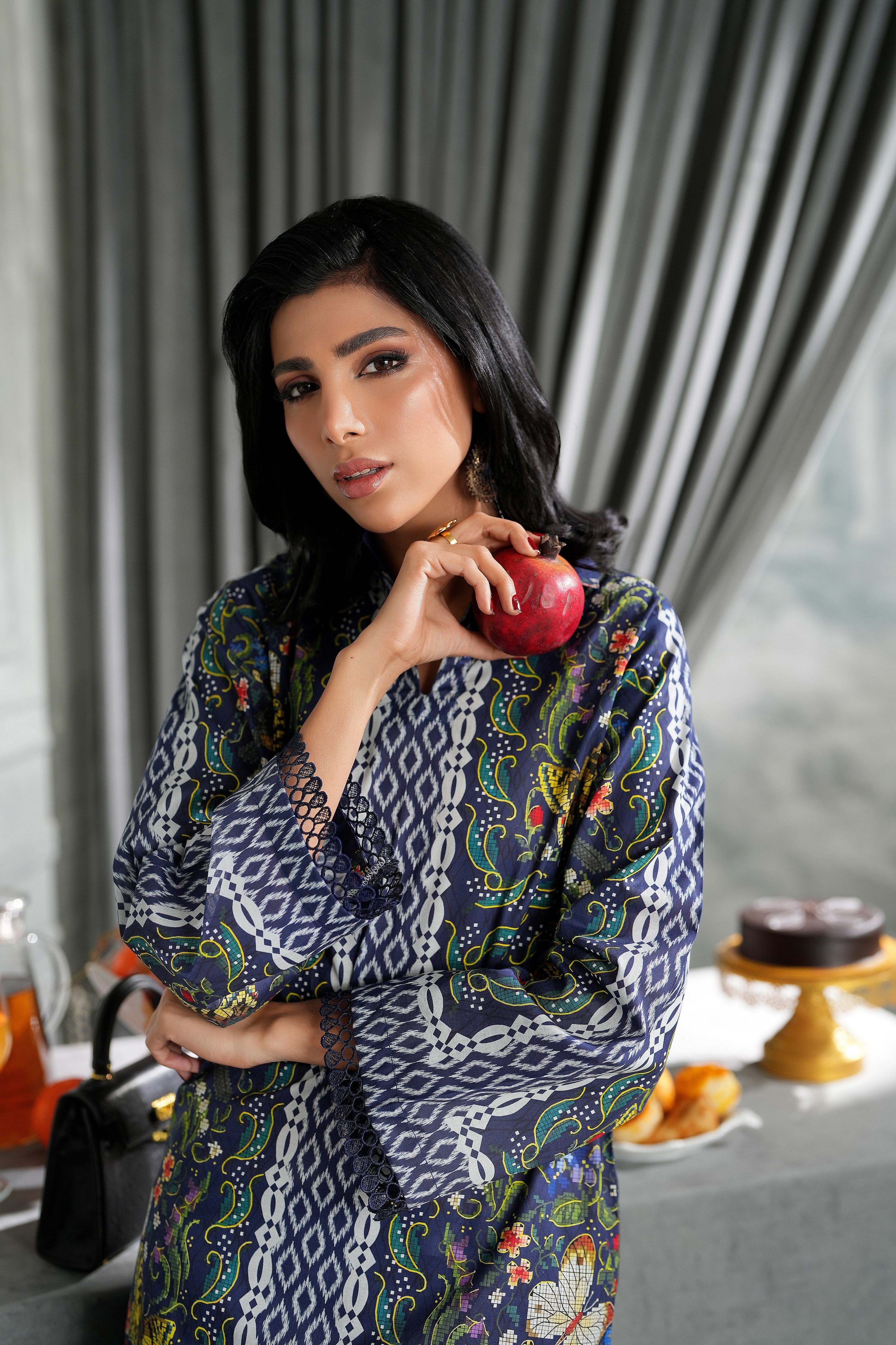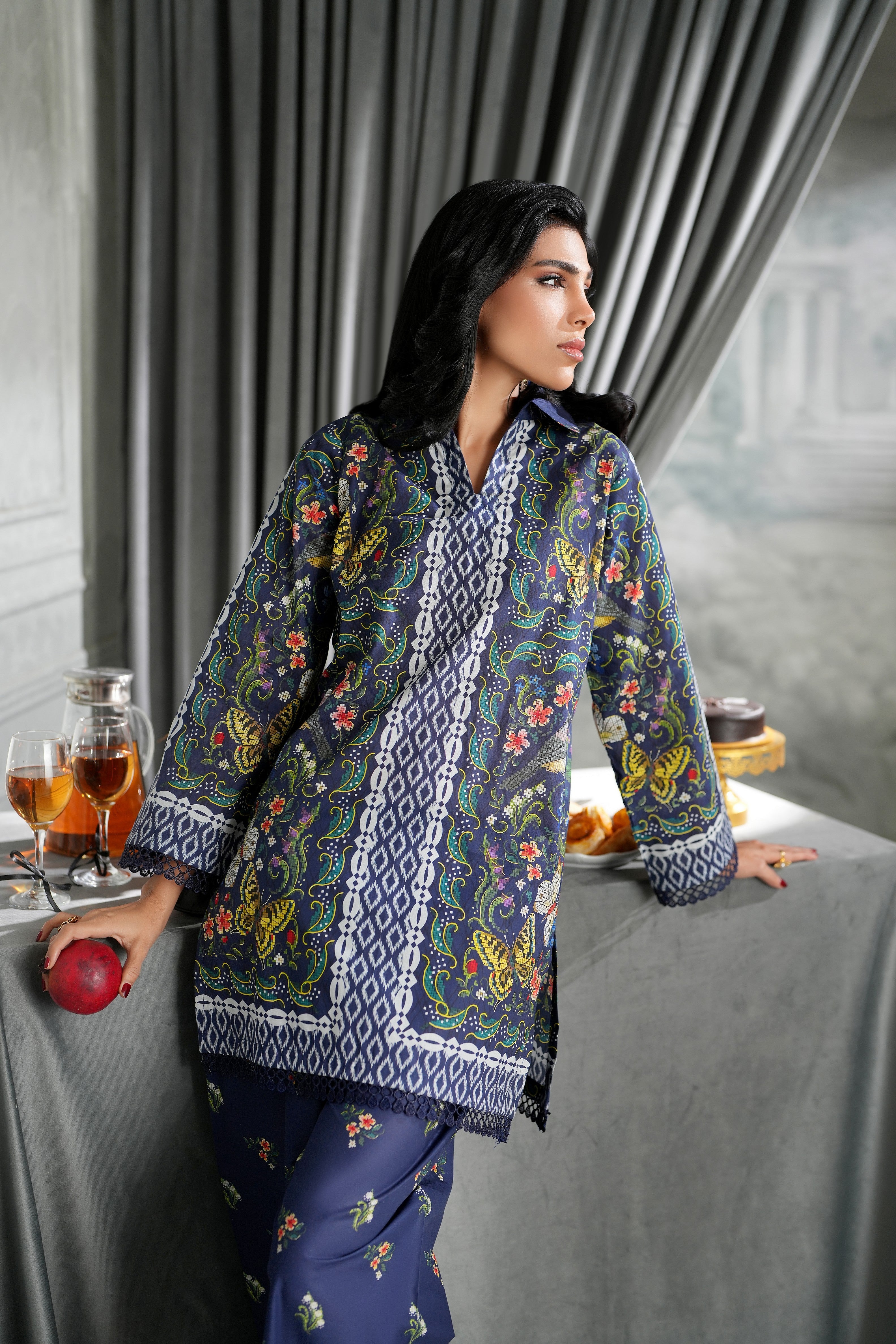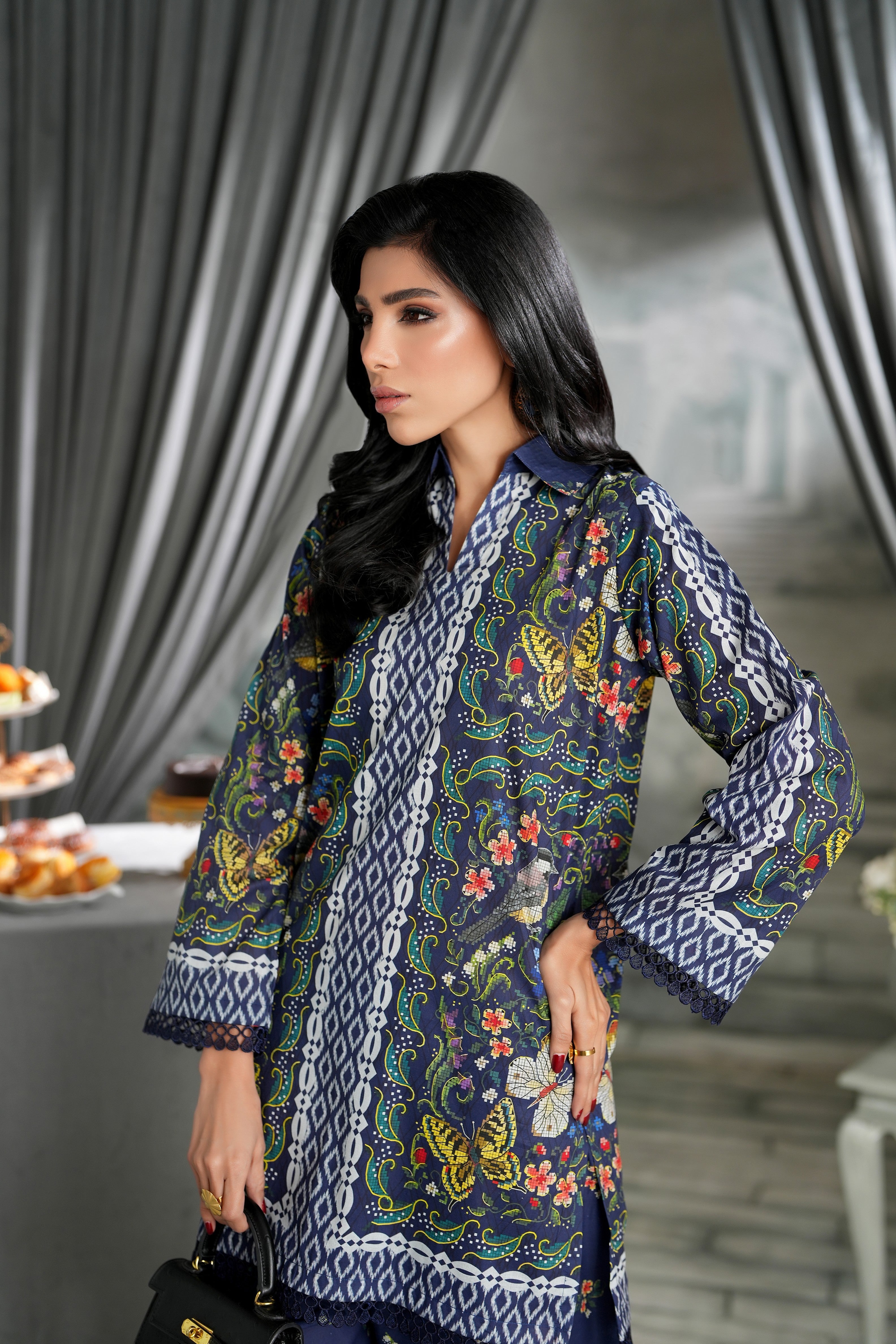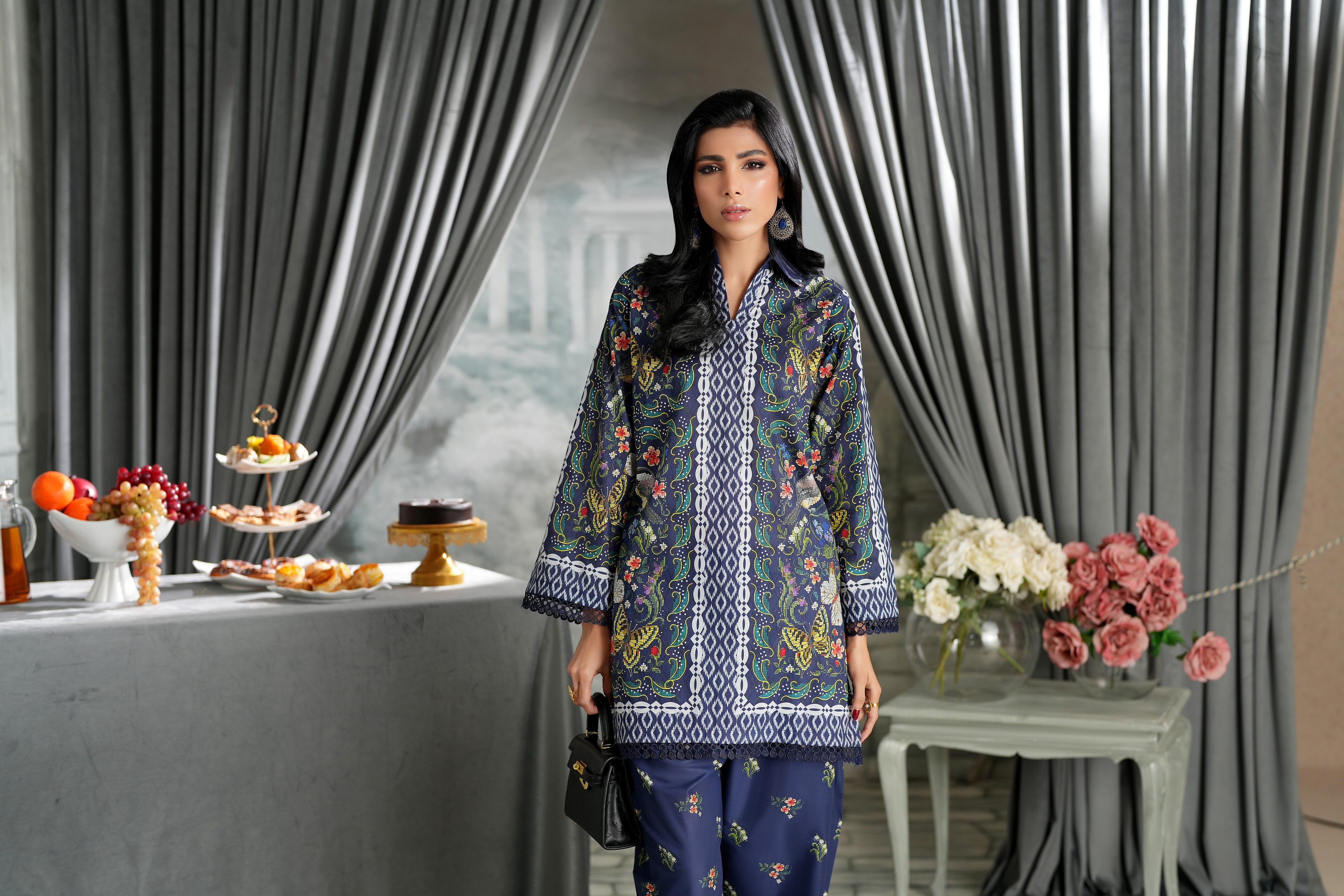 Summary: Embrace sophisticated style with this Navy Blue Pakistani suit by Regalia Textiles. This ready-to-wear co-ord set, crafted from premium Cotton Satin, is perfect for the Fall/Winter season, offering a smooth feel and elegant drape. The shirt features a chic collar and a beautifully detailed printed placket, set against an intricate all-over pattern. As a versatile piece of ethnic wear, this Pakistani dress is an excellent choice for formal gatherings or semi-formal parties. Its deep navy hue exudes class, making it a standout formal outfit ideal for creating a lasting impression at any event.