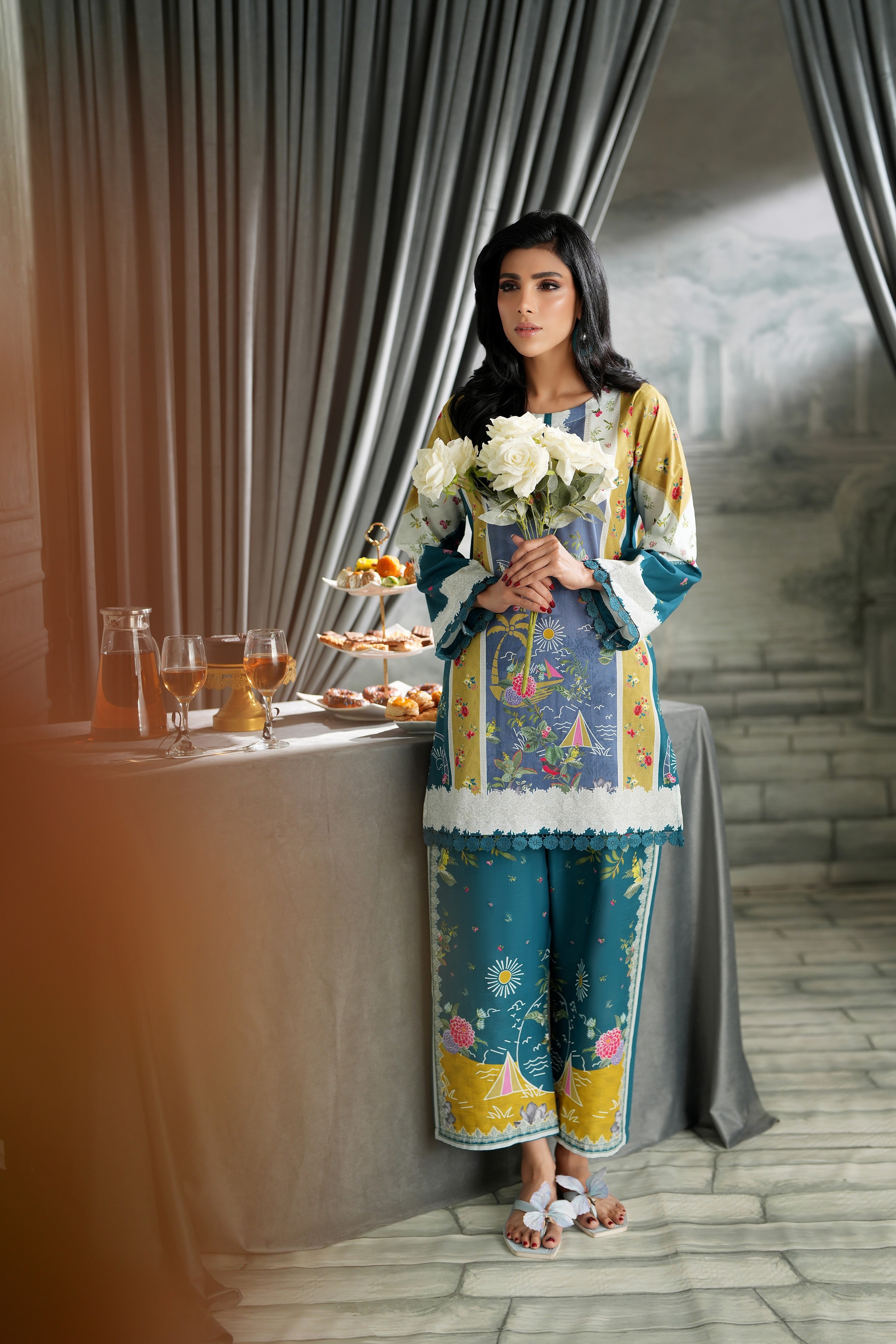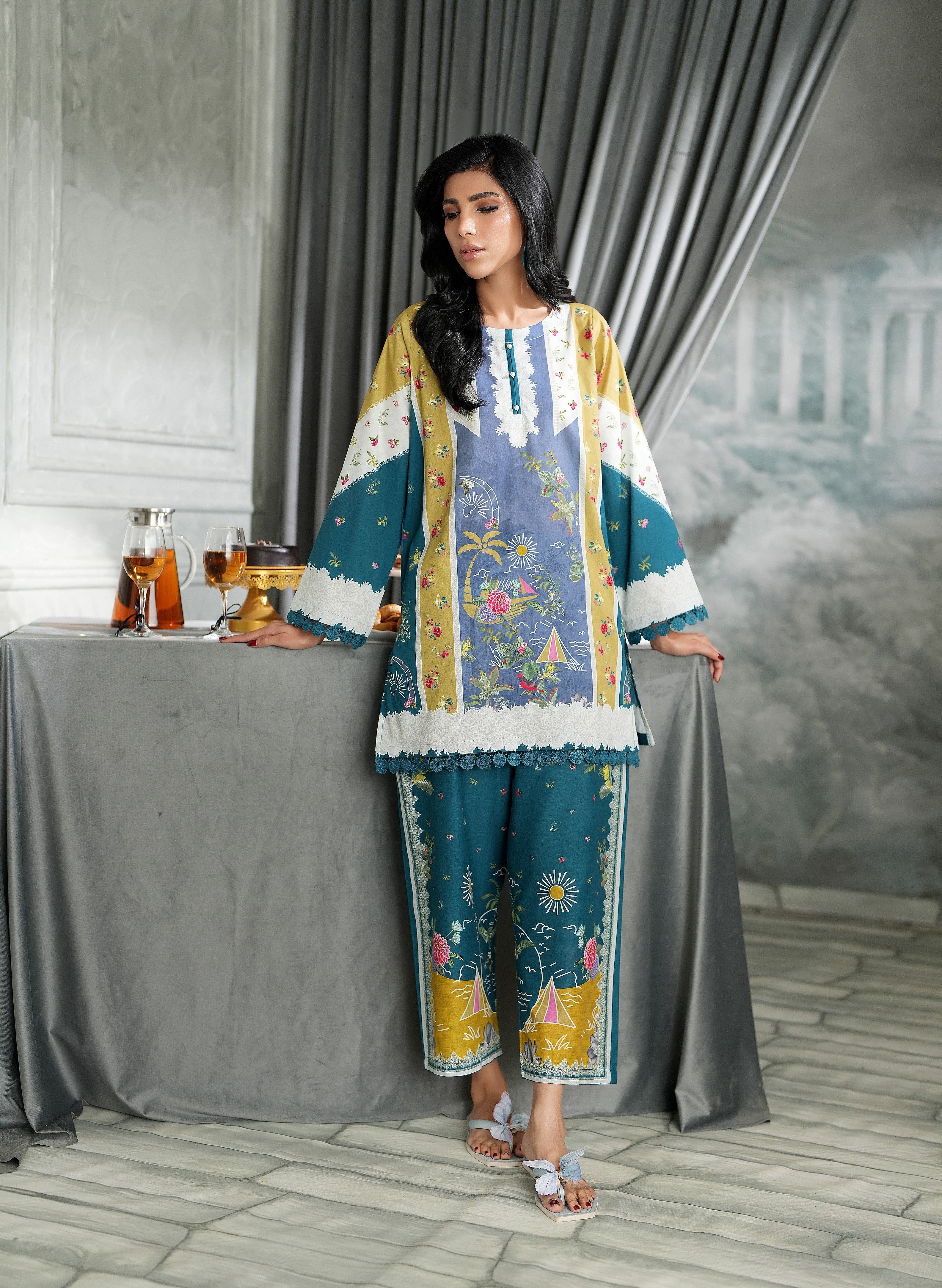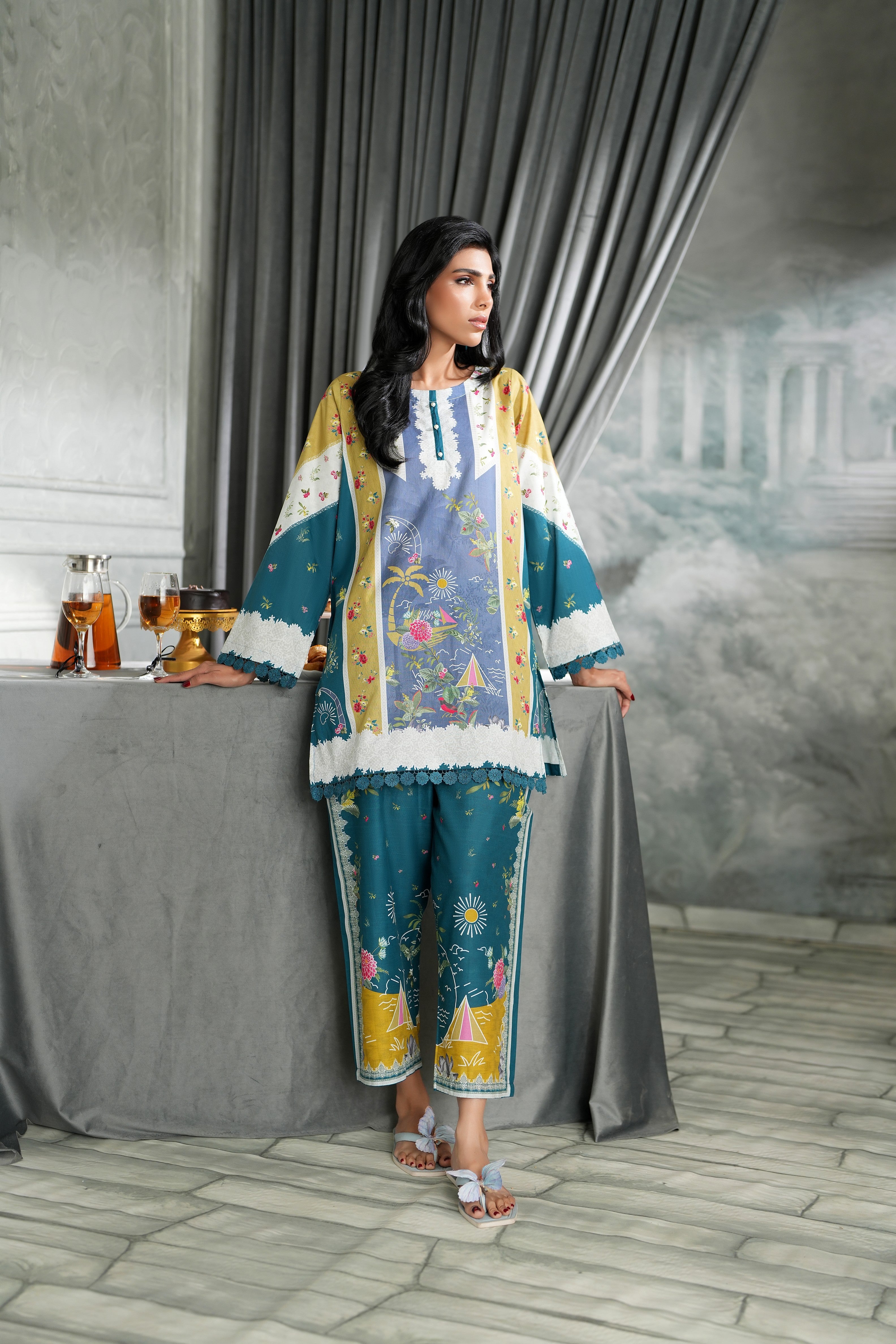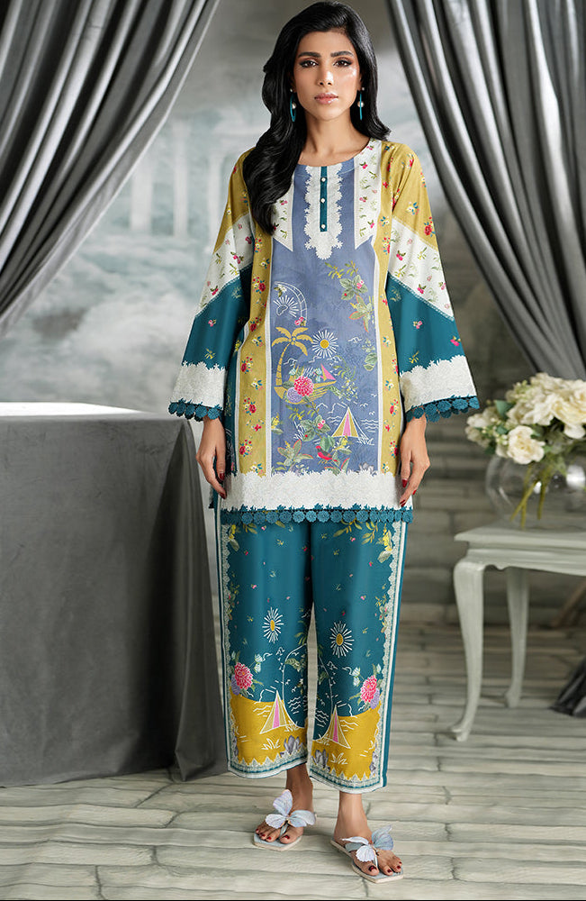 Summary: Discover the Regalia Cocoon Basic Pret Co-Ord, a stunning Pakistani suit featuring a sophisticated Teal base complemented by artistic panels of Mustard and a serene blue. Crafted from breathable Lawn fabric, this ensemble is a perfect choice for the Spring/Summer season, ensuring all-day comfort and style. This ready-to-wear ethnic outfit features a straight-cut kameez with an intricate print, making this Pakistani Lawn Dress ideal for daily wear or casual festive gatherings. Embrace effortless elegance with this chic and contemporary co-ord set.