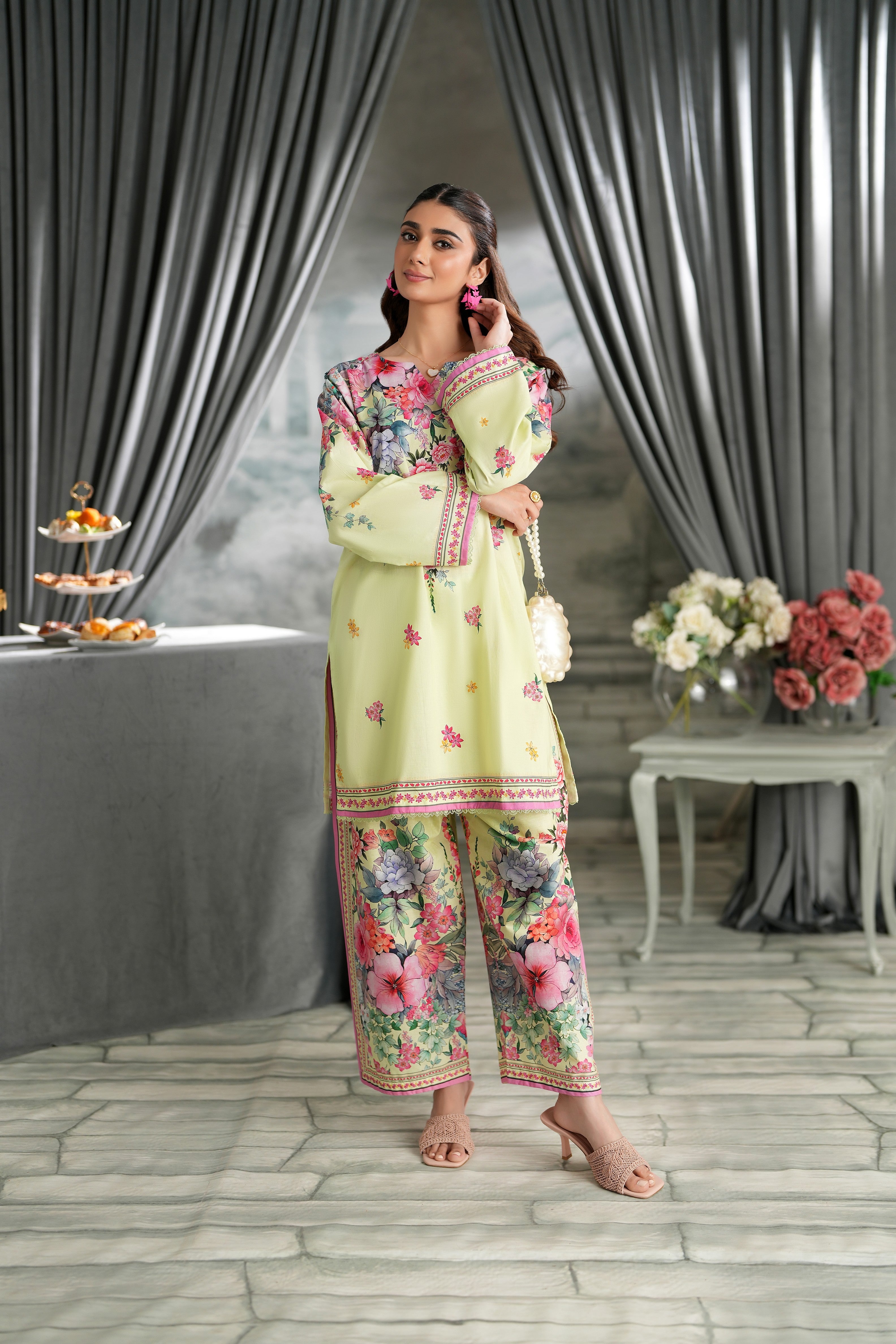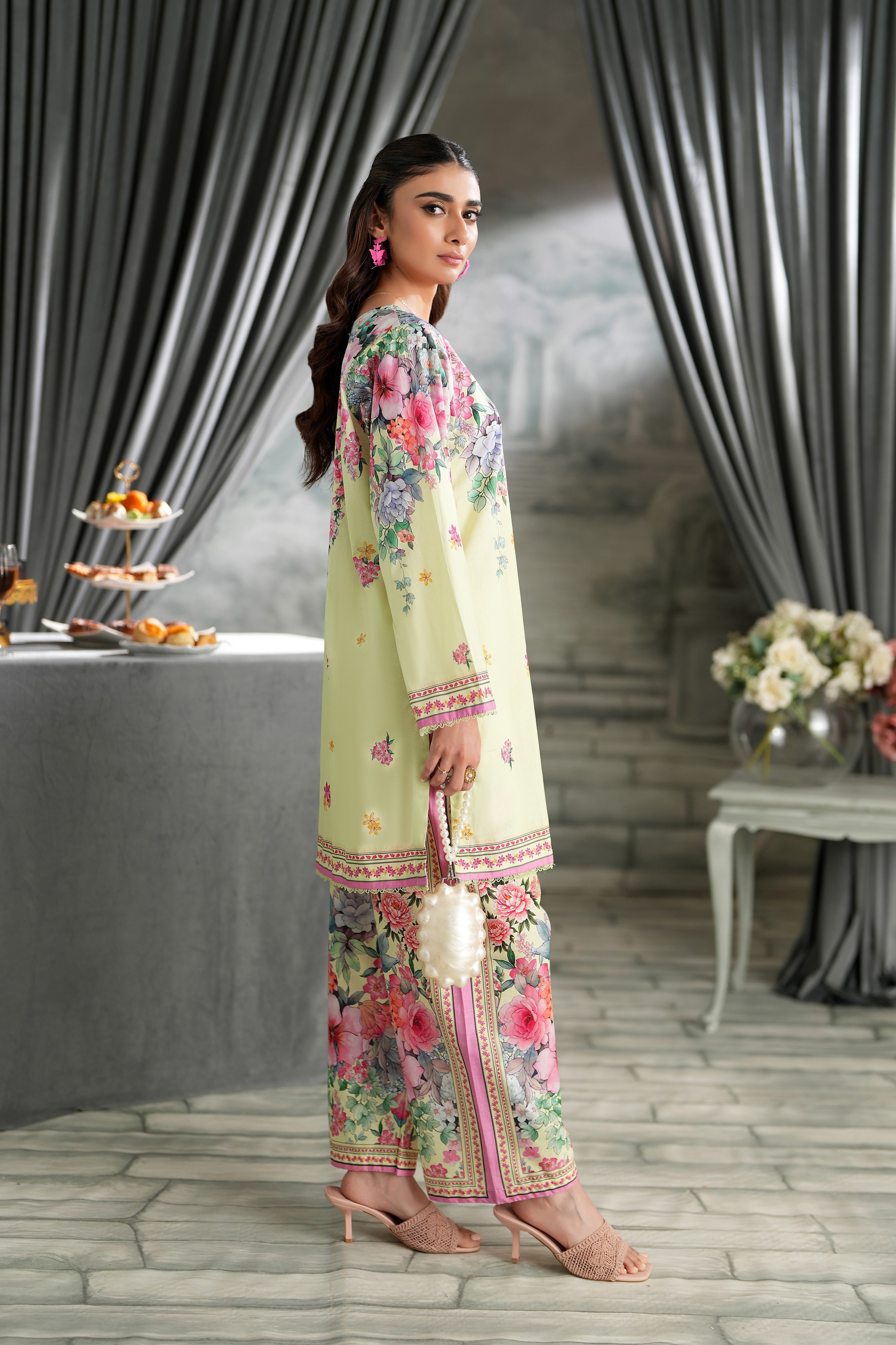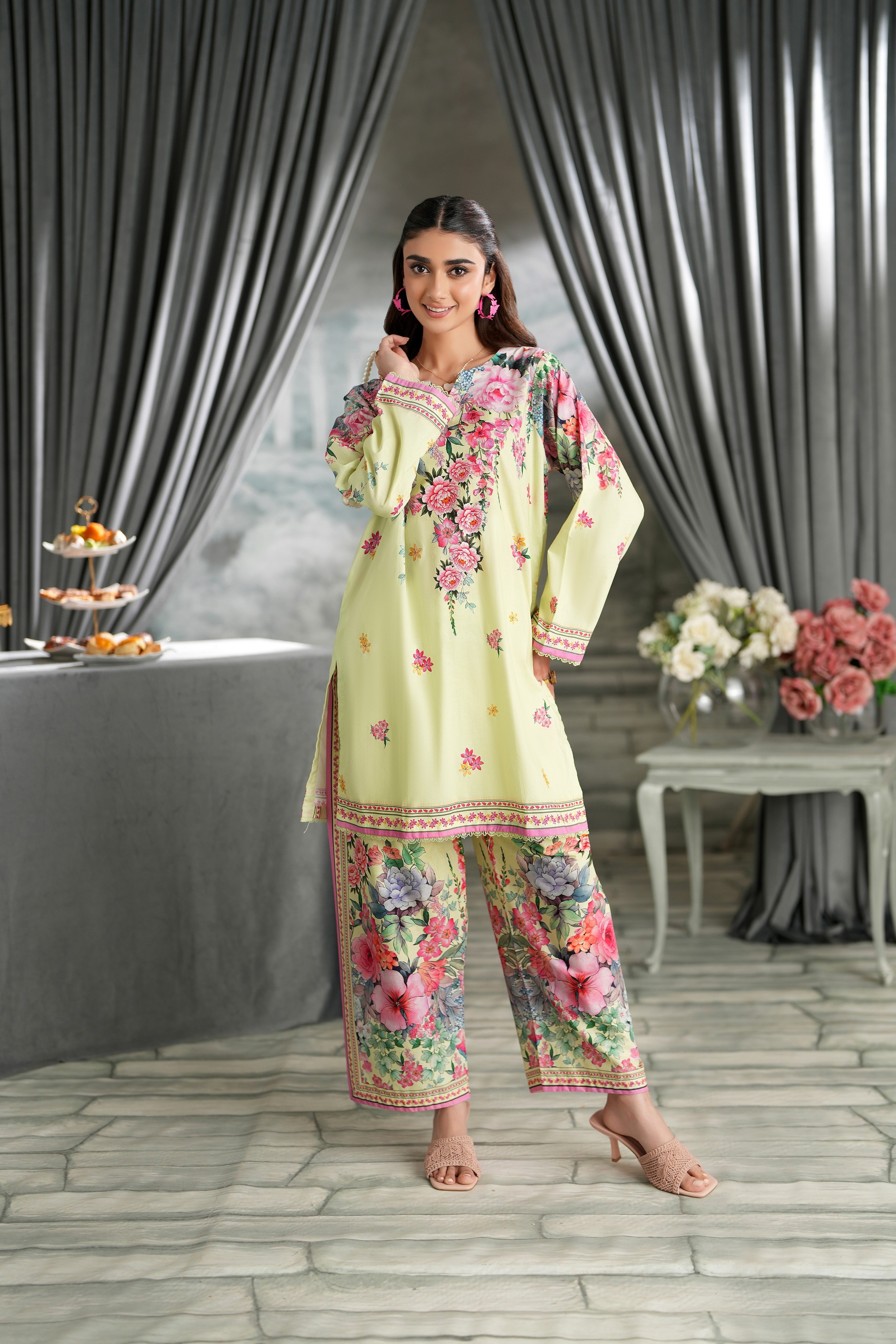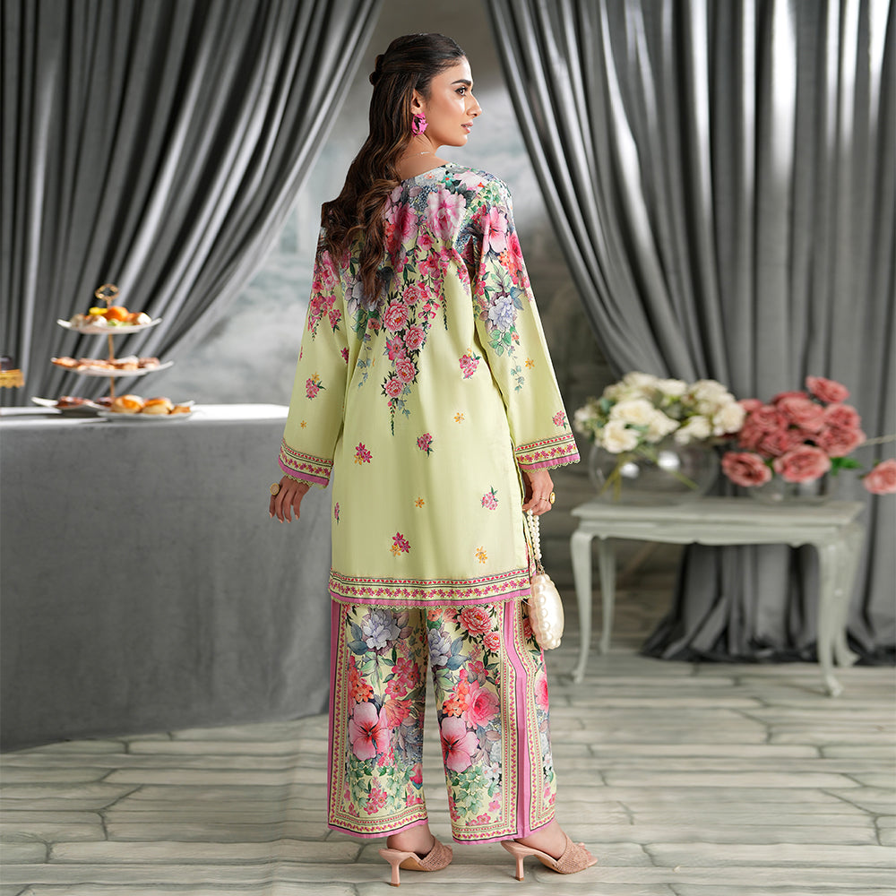 Summary: Embrace the essence of spring with this stunning Yellow Pakistani Suit by Regalia Textiles. This ready-to-wear co-ord set, crafted from lustrous Cotton Satin, offers both comfort and elegance for the warmer seasons. The kameez is adorned with a vibrant, all-over floral print, making it a standout piece of ethnic wear. Its breathable fabric and bright aesthetic make this summer outfit perfect for daytime festivities. As a chic Pakistani dress, its cheerful design is ideal for Eid gatherings, garden parties, or festive brunches. Shop this beautiful festive clothing to add a touch of floral elegance to your wardrobe.