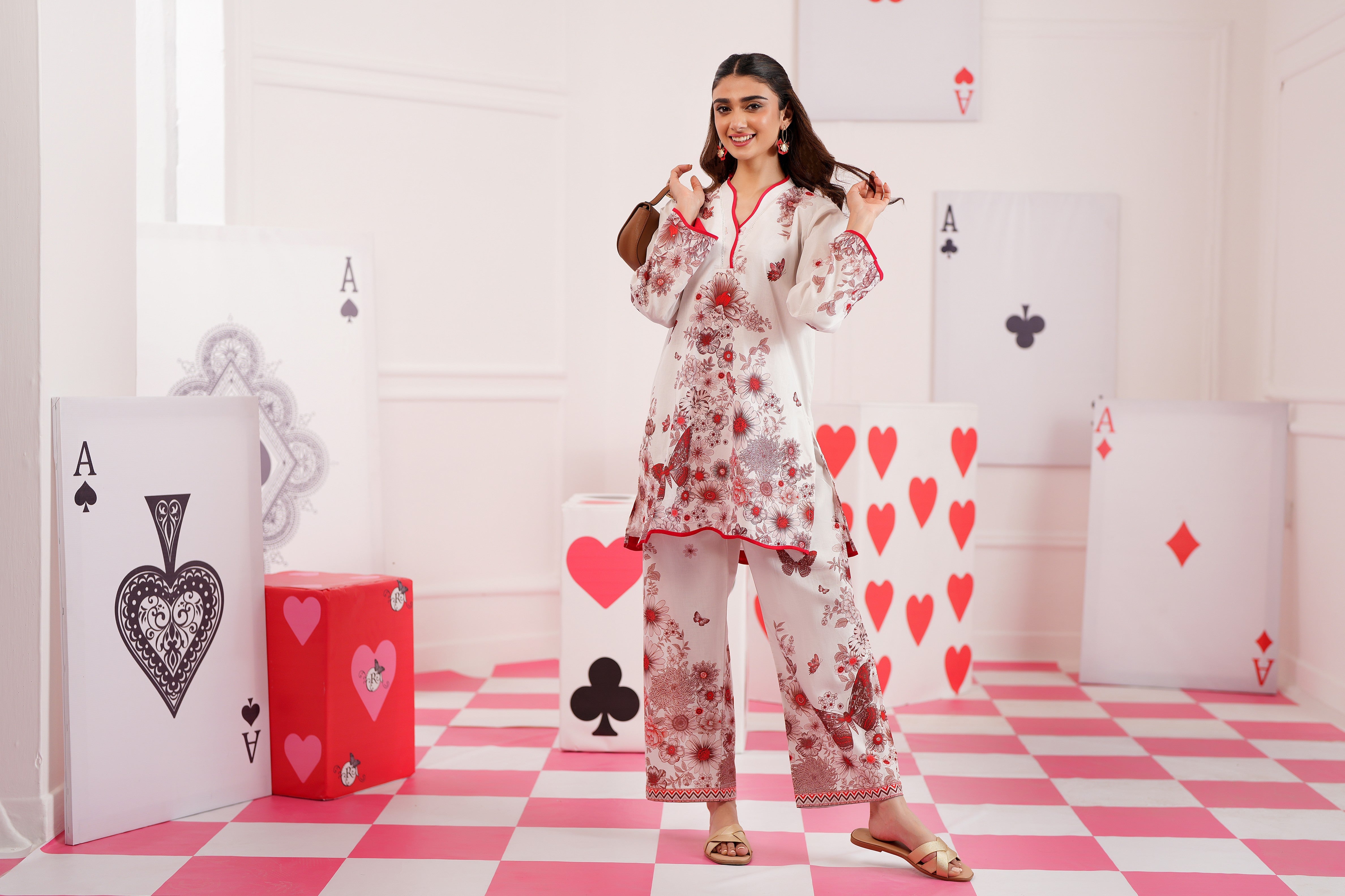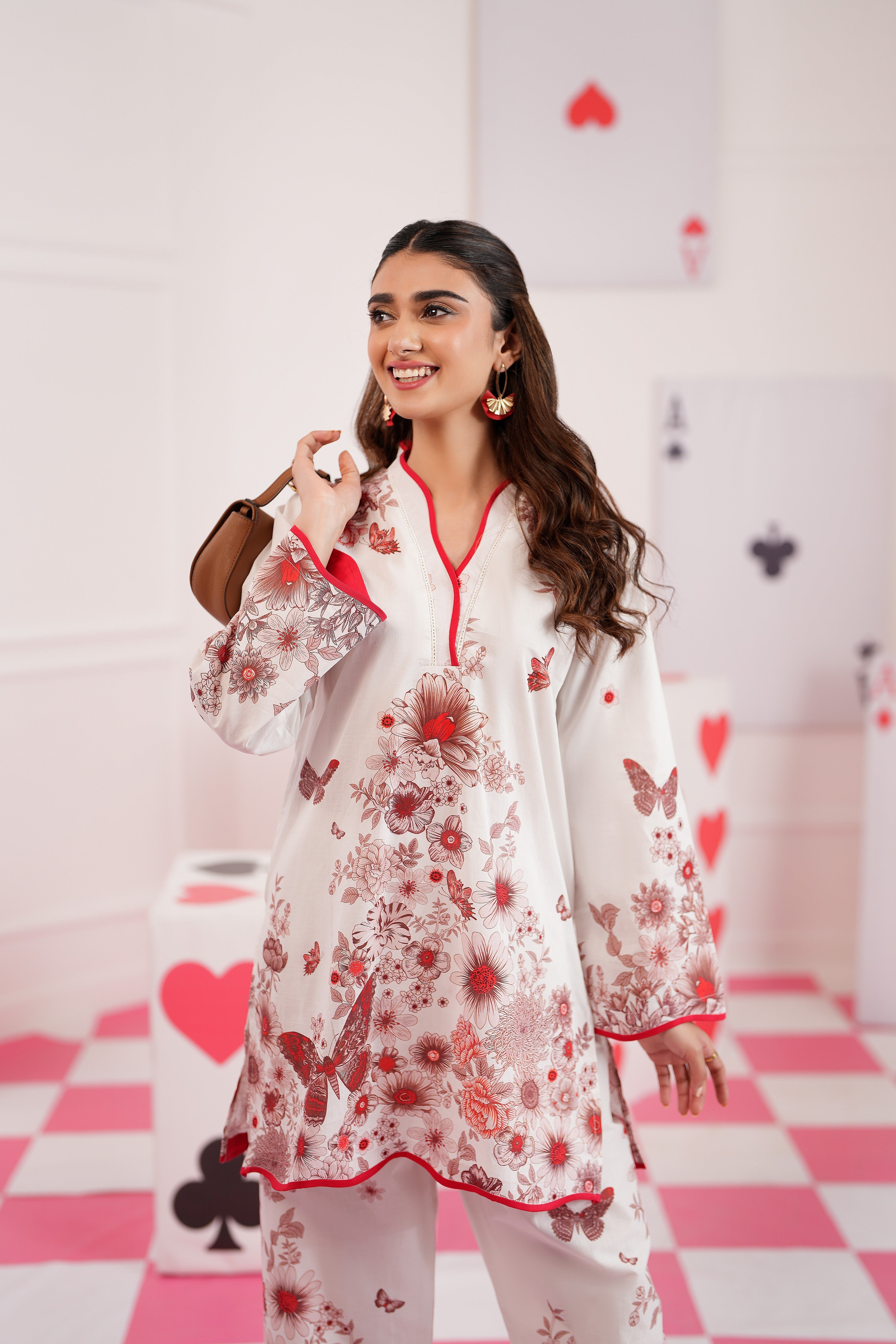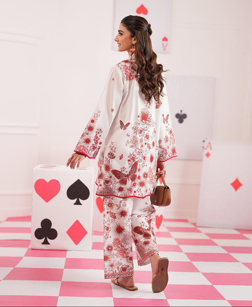 Summary: Embrace effortless elegance with the Regalia Cocoon Basic Pret Co-Ord. This stunning Pakistani suit features a sophisticated off-white kameez crafted from a lightweight, breathable lawn fabric, ideal for the Spring/Summer season. The shirt is adorned with a beautiful floral and butterfly print in contrasting shades of red and brown. It's styled with a classic V-neckline and full sleeves, both accented with a sharp red trim for a pop of color. As a versatile piece of ethnic wear, this co-ord set is perfect for daily wear, casual outings, or daytime events, offering a chic and contemporary look.