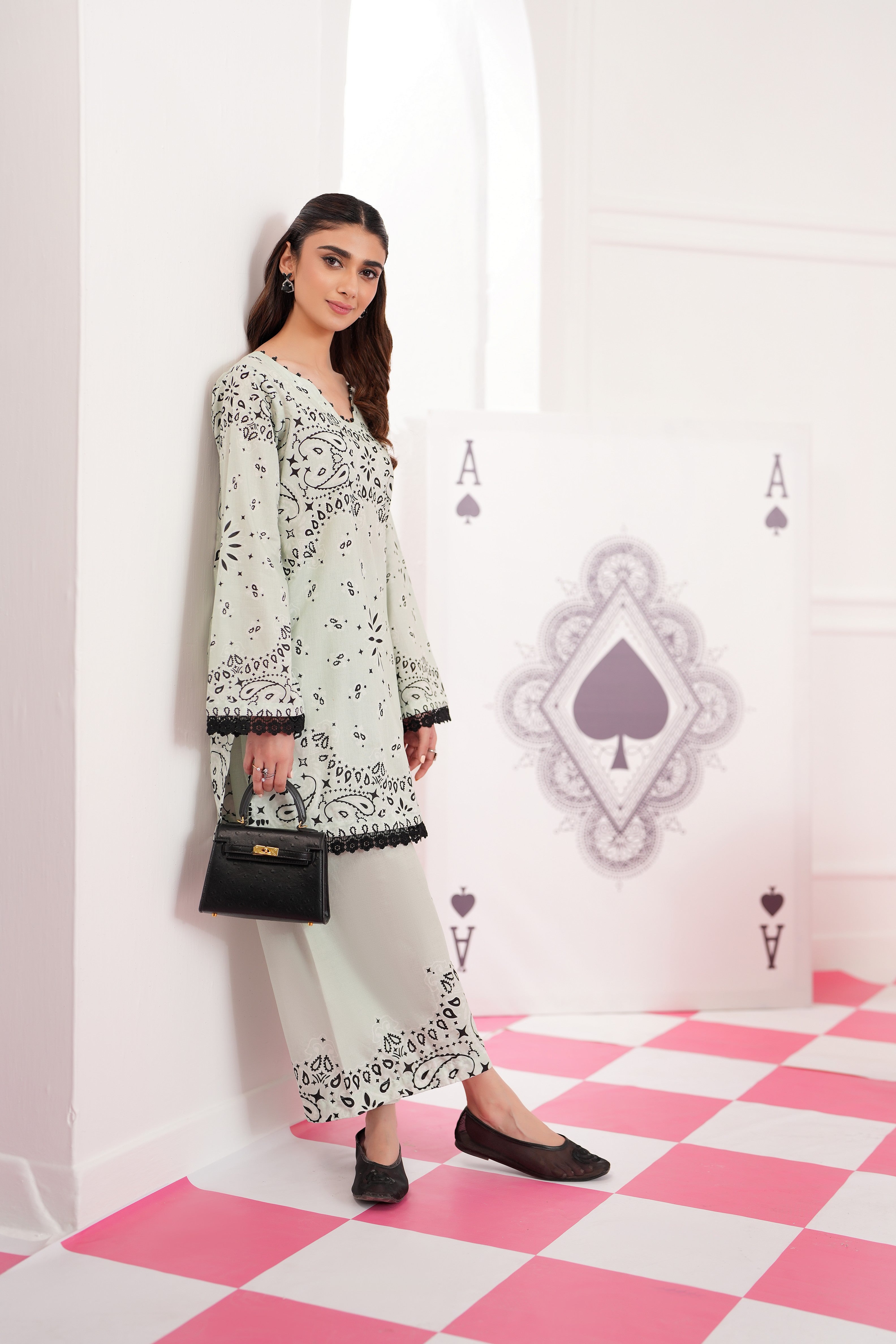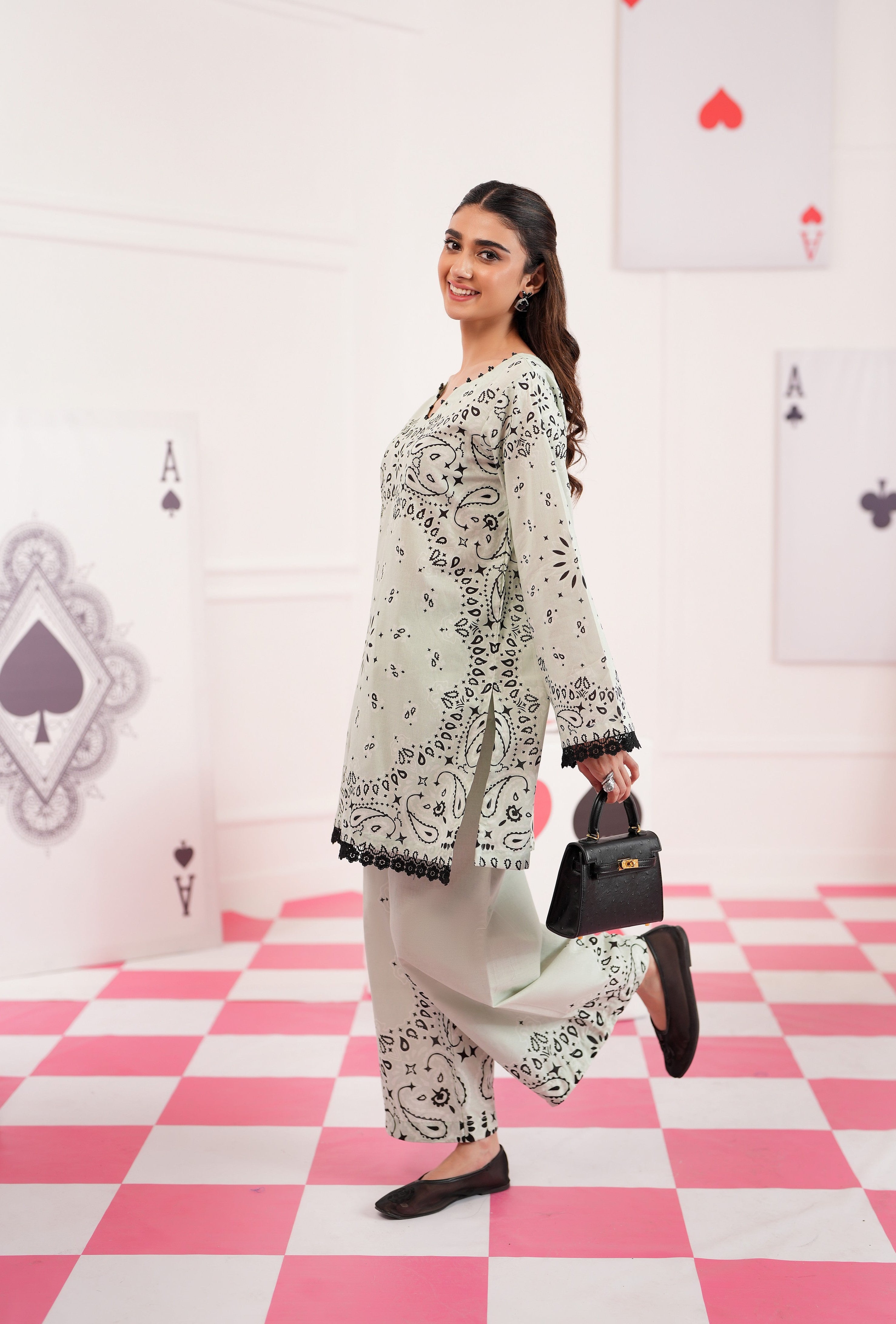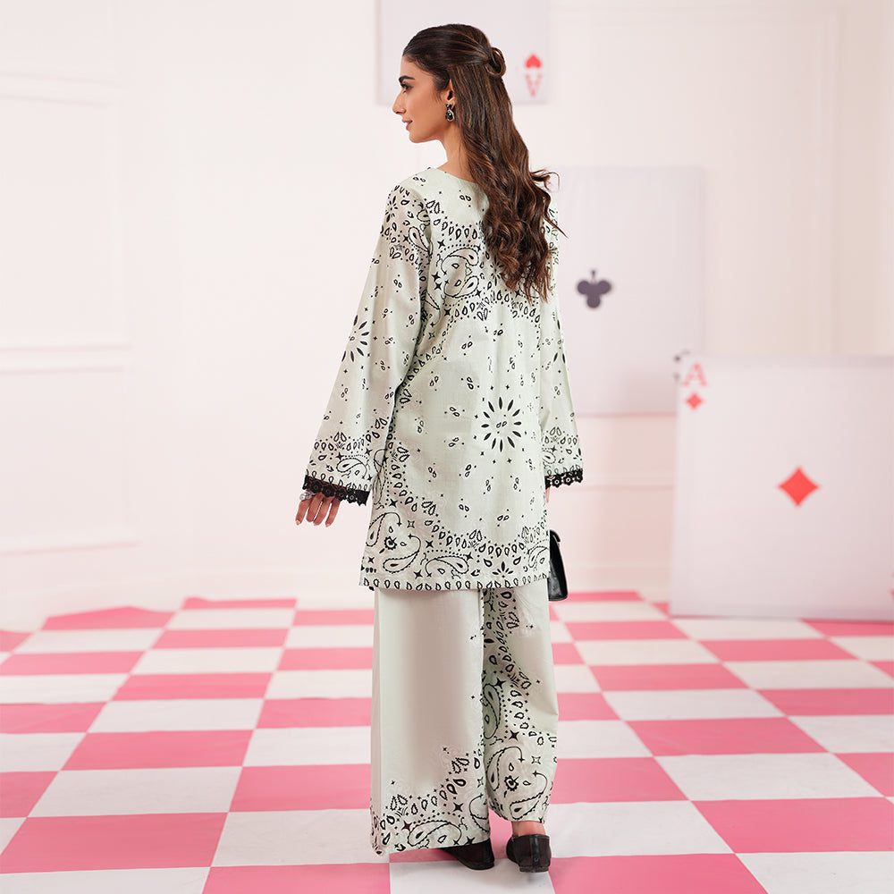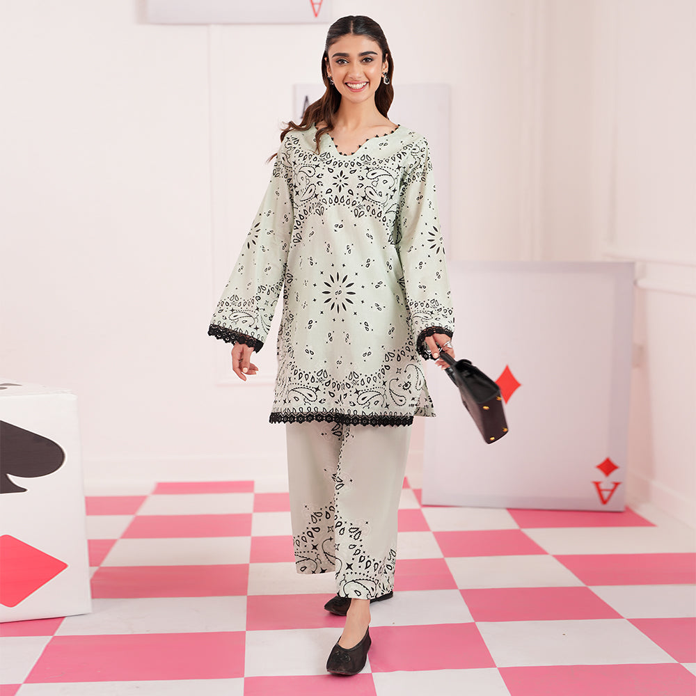 Summary: Embrace effortless elegance with the Regalia Cocoon Basic Pret Co-Ord set. This stunning Pakistani suit features a shirt and trouser in a serene Sea Green hue. Crafted from premium lawn fabric, this outfit is lightweight and breathable, making it an ideal choice for the Spring/Summer season. The kameez is adorned with a distinctive black print and finished with delicate lace trim on the sleeves and hemline, adding a touch of sophistication. As a versatile piece of ethnic wear, this co-ord set is perfect for daily wear and casual outings, offering a blend of comfort and contemporary style.